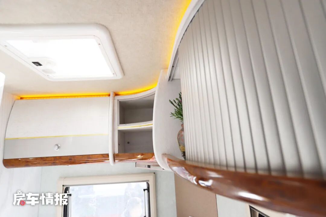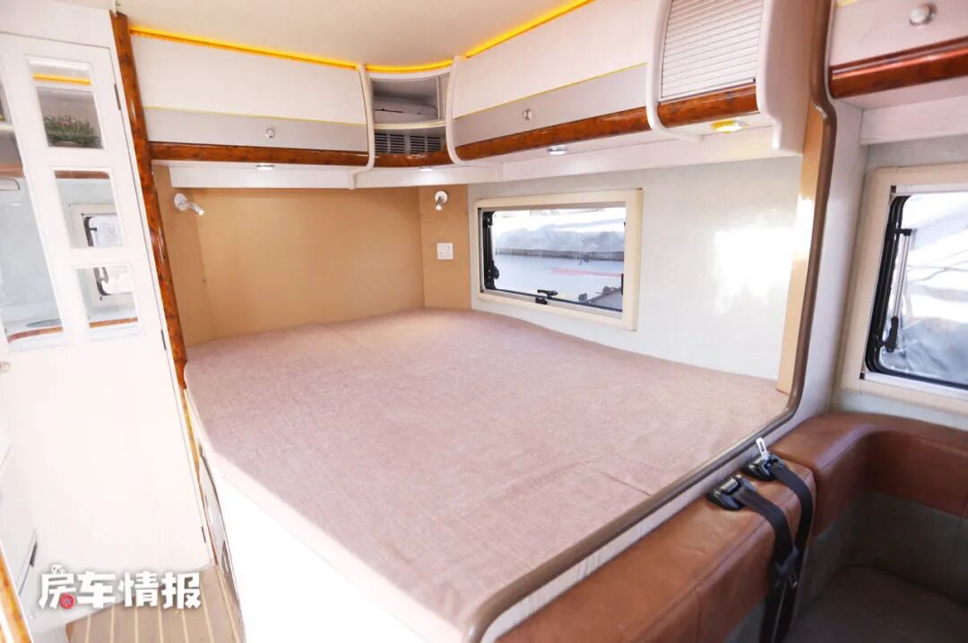 后部的休息区内提供了一张纵置的双人床,尺寸为1850*1375(mm),横向面积还不错,所以平时可以睡2-3人,绝对没有问题。而且旁边设置了大尺寸的外推窗,所以非常的明亮。床铺的上方还提供了一圈L型的储物吊柜,平时可以放一些衣物,拿取时也很方便。另外在床头处还提供了阅读灯和充电接口,方便平时使用。