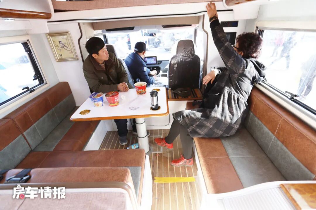 靠近车门的地方是一个小的桌子,下面镶嵌了一台双开门的冰箱,平时放一些饭菜也是够用的。