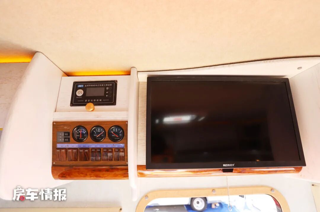 水电方面,这款房车和YJ2是相同的,同样搭载了一台3000W的充逆变一体机,提供620Ah的磷酸铁锂电池,车顶部还配备了800W的太阳能电池板,车内提供了车载电视和行车空调。水路上也同样提供了120L的净水箱和120L的污水箱,并搭载了一台房车专用隔膜加水泵,完全可以满足平时在外的用水用电需求。