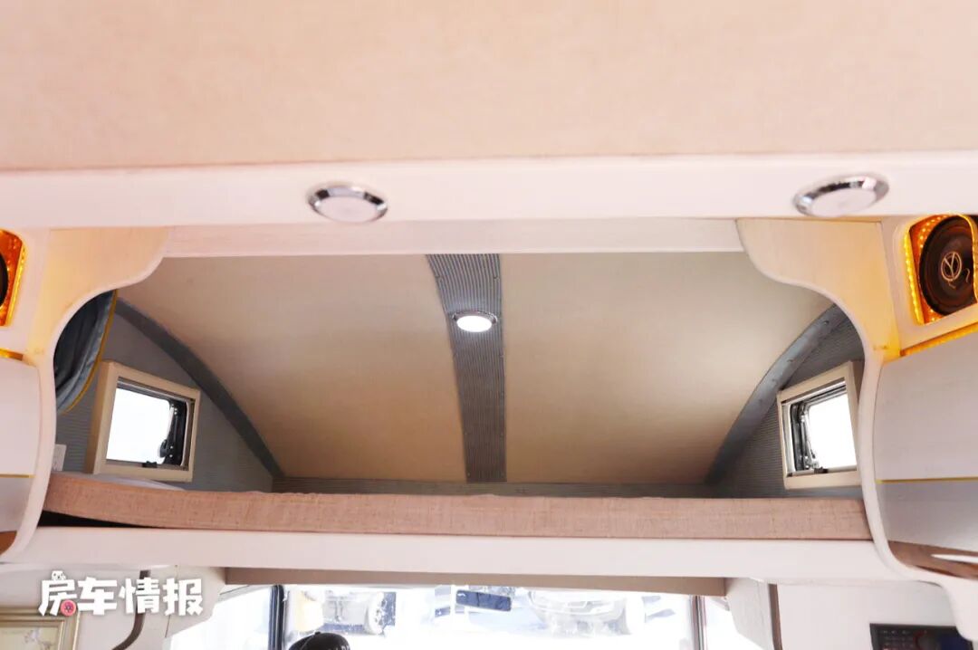 夜晚需要休息的时候,可以将沙发与餐桌拼接成一张大尺寸的通铺,另外在前方驾驶室上方的额头内部,还提供了一张尺寸为2265*1800(mm)的额头床,整车的床铺空间是非常充足的。