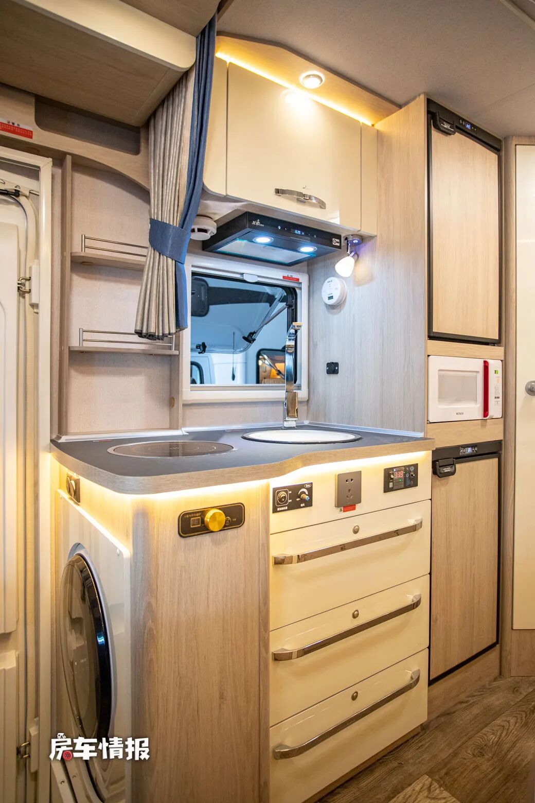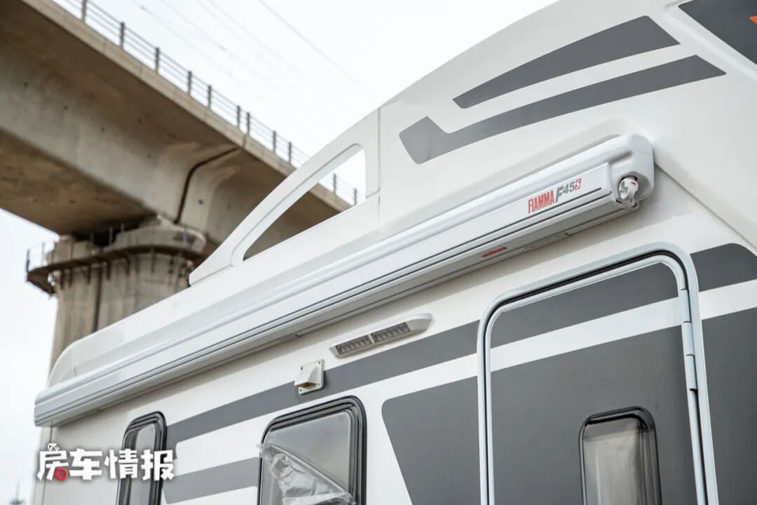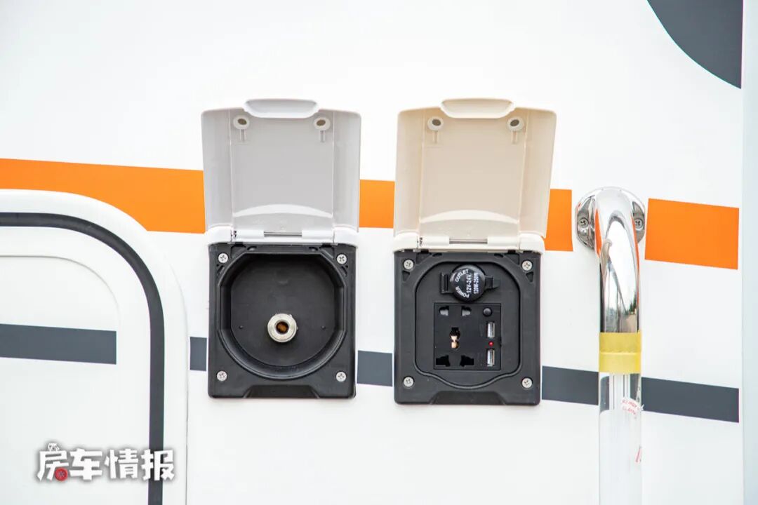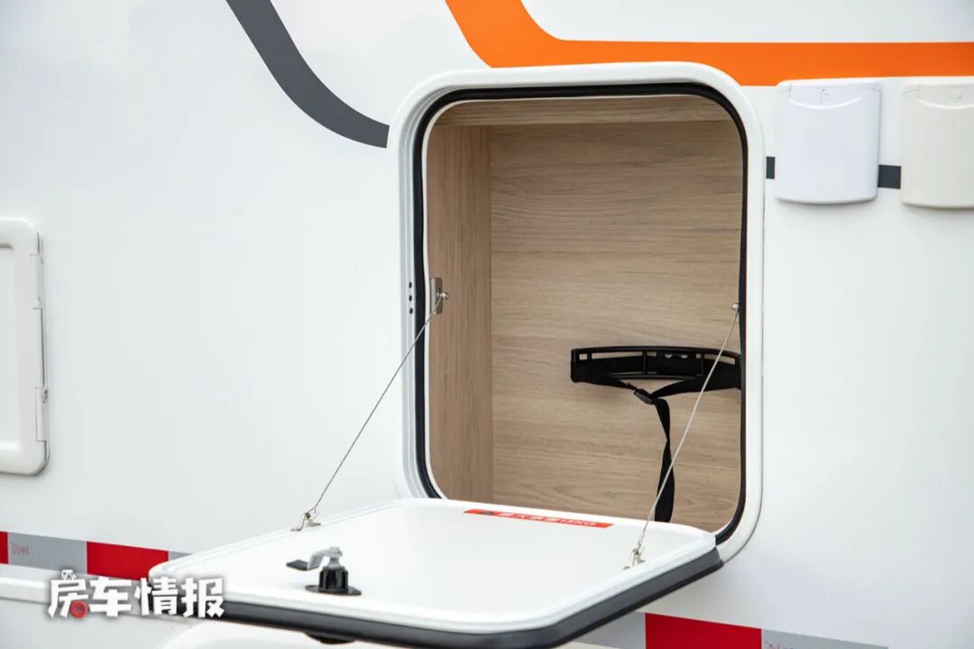 车身外部也配置了相当丰富的生活配置,包括遮阳棚、储物舱、电动踏步、水电接驳口和可以存放15kg的燃气罐舱等。