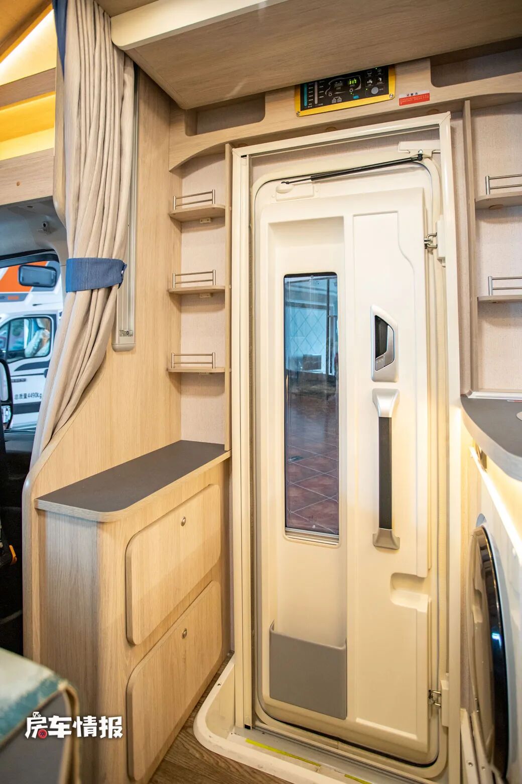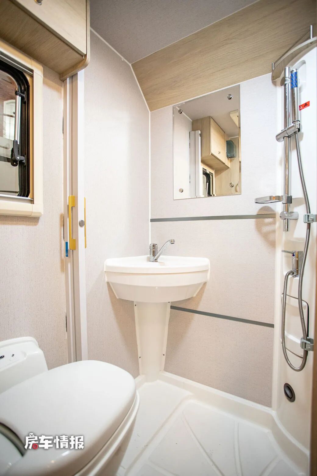 这款房车的卫浴区采用了干湿分离的设计,最外面提供了马桶和储物吊柜,拉开折叠门,可以看到里面的淋浴区,并配备了洗手池、淋浴花洒和梳妆镜,整体的卫浴室设计非常的人性化。