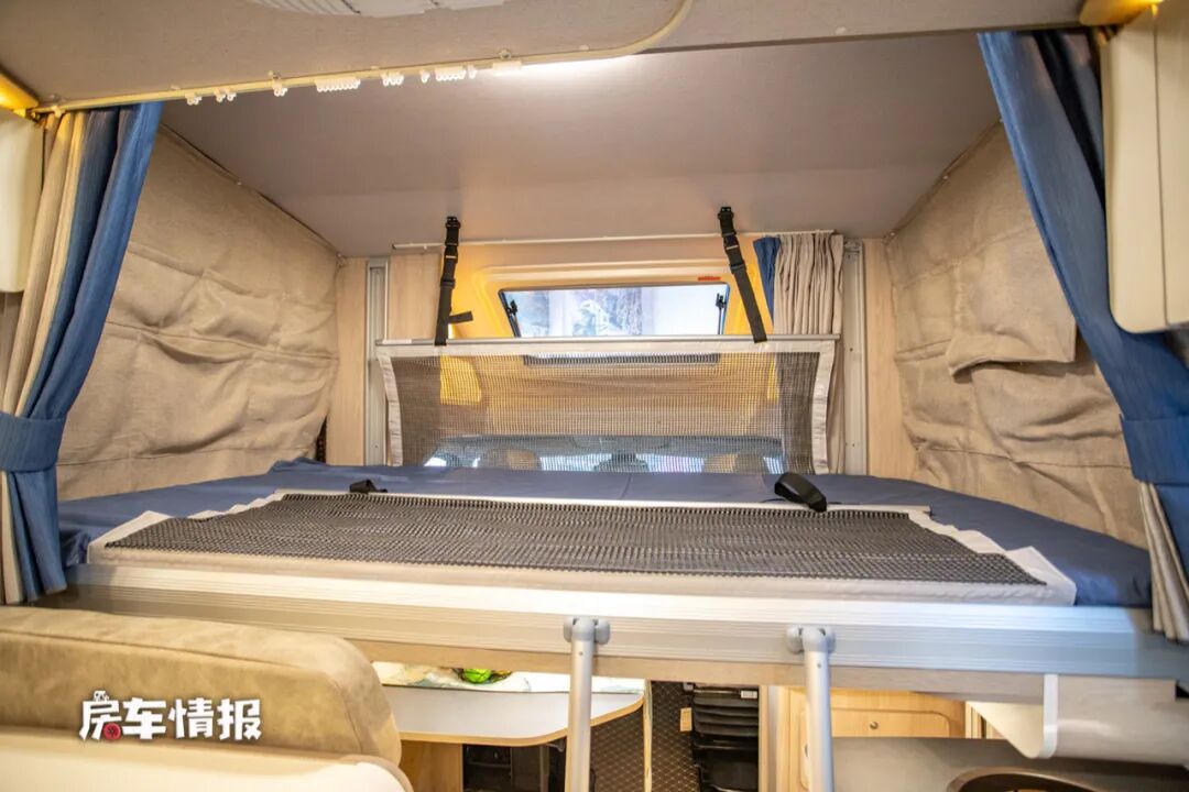 虽然这款房车采用了小顶设计,没有了额头床,但是在会客区的上方还隐藏了一张升降床,尺寸为2000mm*1100mm,也可以躺下两个成年人,另外升降床两边都带有护网,即便是小朋友在上面睡觉,也可以非常的放心,床头床尾处还带有储物袋,可以放一些充电器之类的小物件,方便晚上给手机手电。