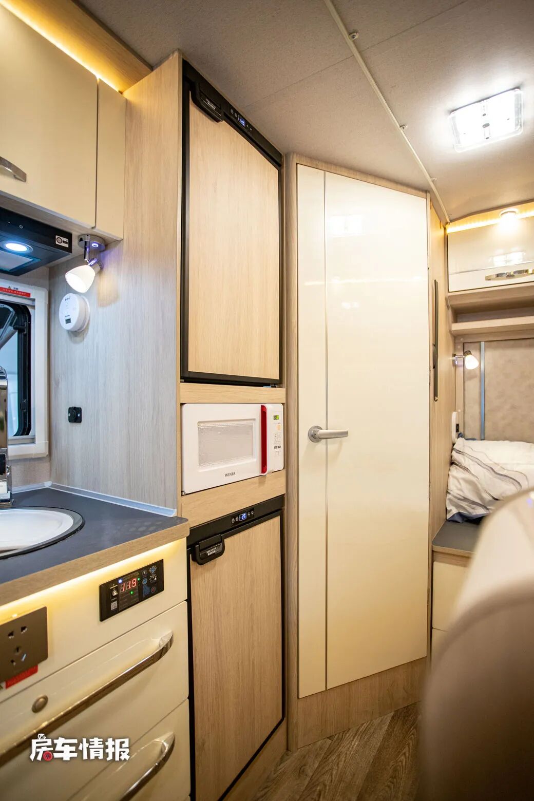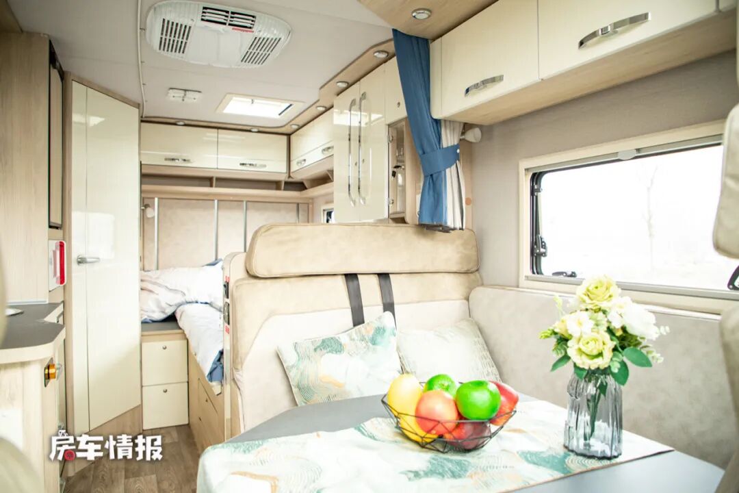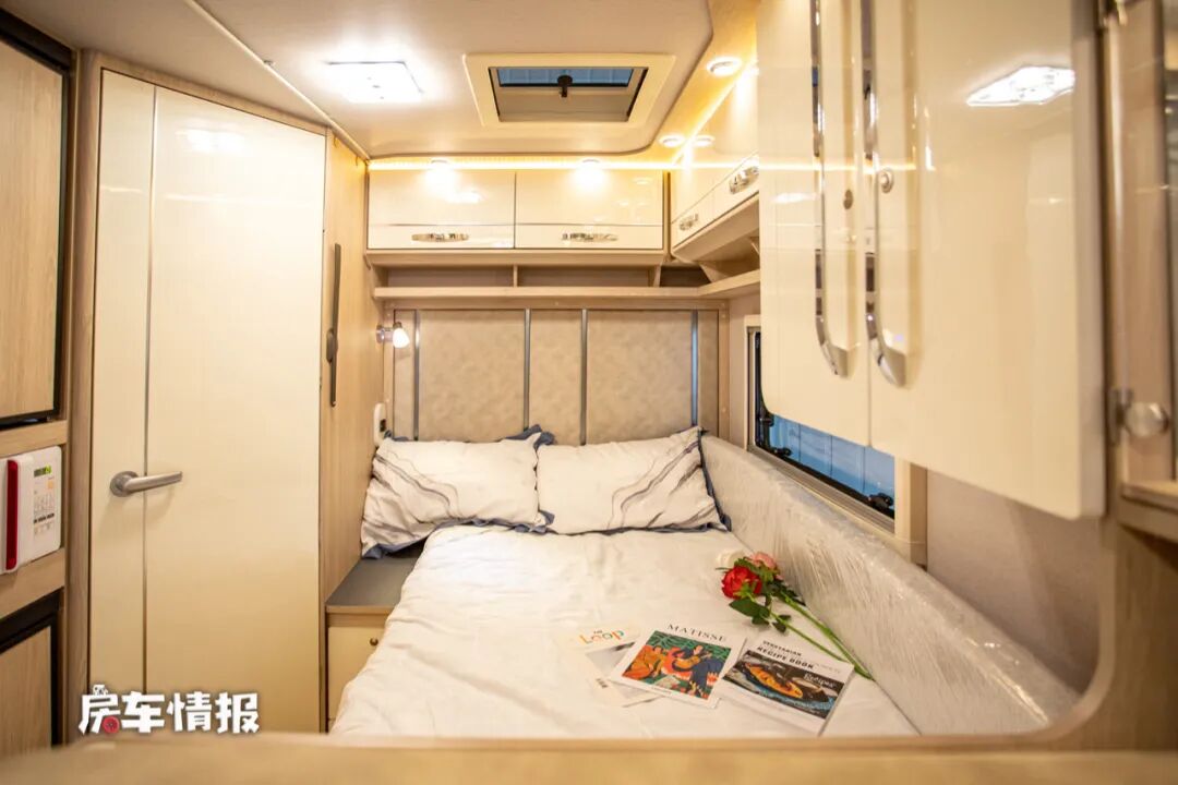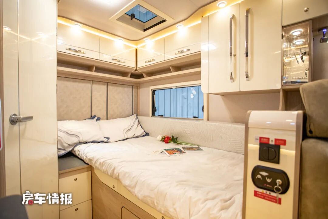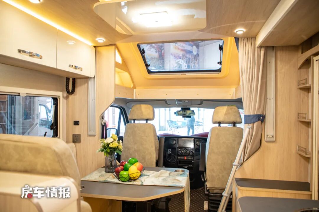 因为采用了小额头的设计,所以取消了常见的额头床,取而代之的大尺寸的弧形天窗以及两边带有氛围灯的储物格,这样的设计为驾驶室也带来了非常好的采光度,也防止从驾驶室进入车厢时会磕碰到头部。