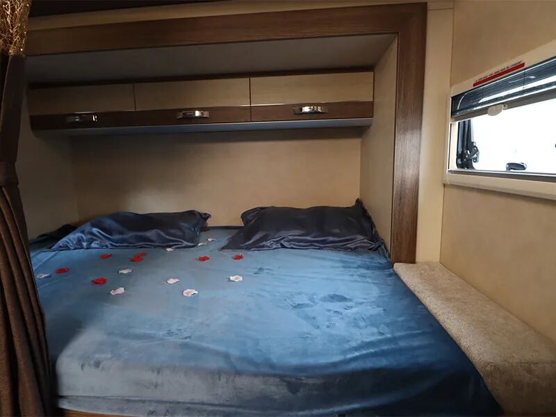来到车厢尾部,拓展打开以后会变成一张尺寸约为2180*1200mm的双人床,同样可以睡下2名成年,加上前方的额头床和沙发床,这款车最多可以满足5-6人同时住宿休息。