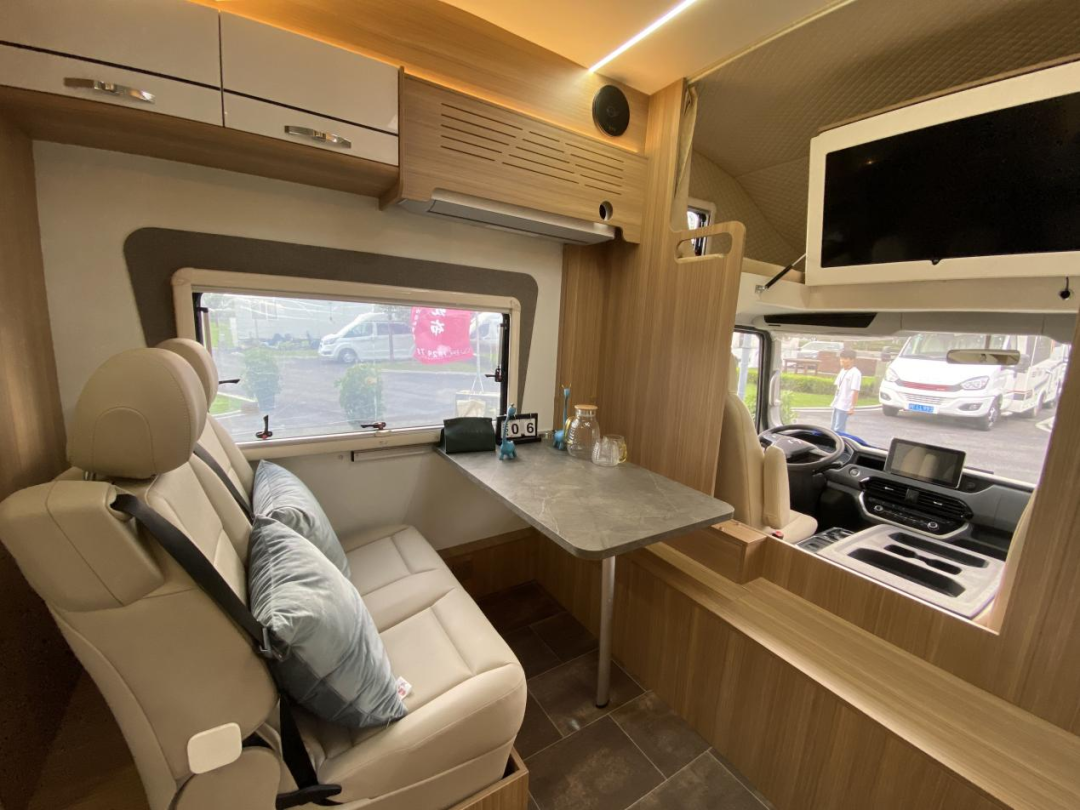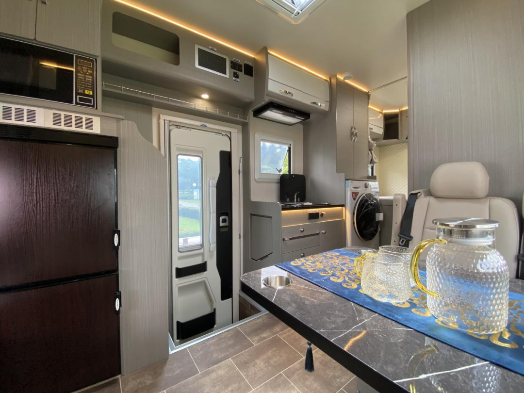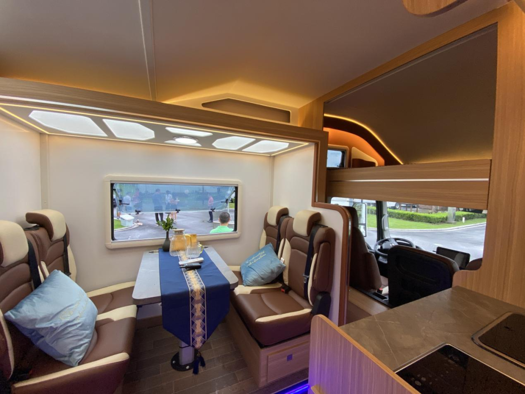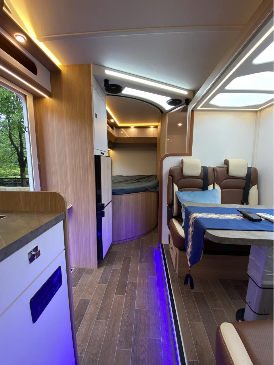 在内饰中采用极简风格设计,氛围营造的非常到位,大面积皮质包裹与杏木饰板相搭配,再加上浅色调的主调,不论是触觉还是视觉都营造出很强的高级感。生活区的配置方面该有的空调,冰箱,电视机那些都一应俱全,较网红3号而言少了一个侧方的拓展舱。