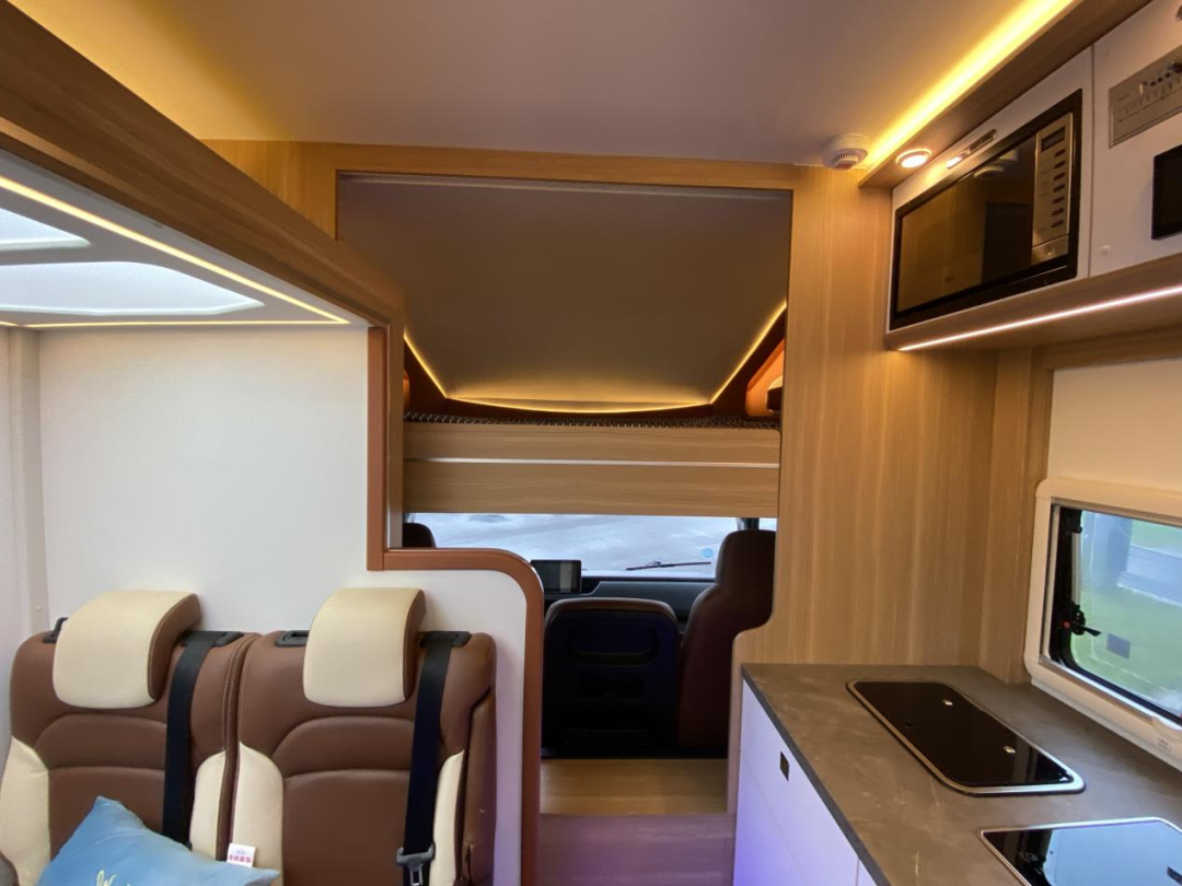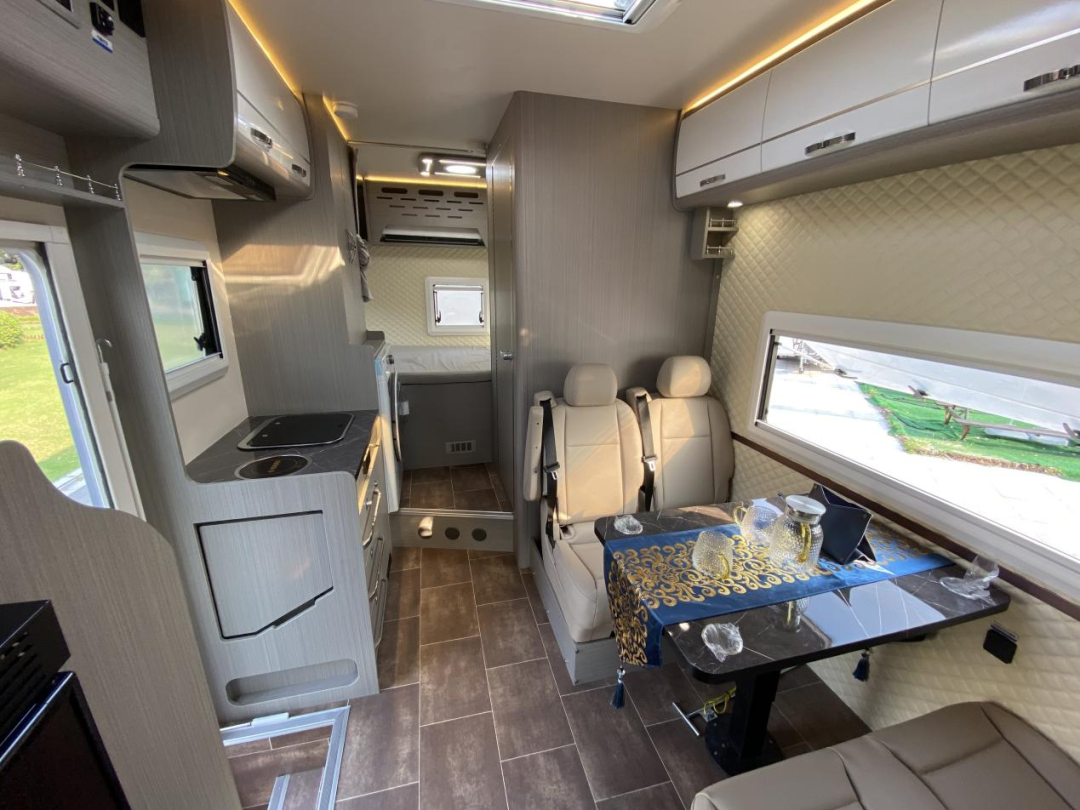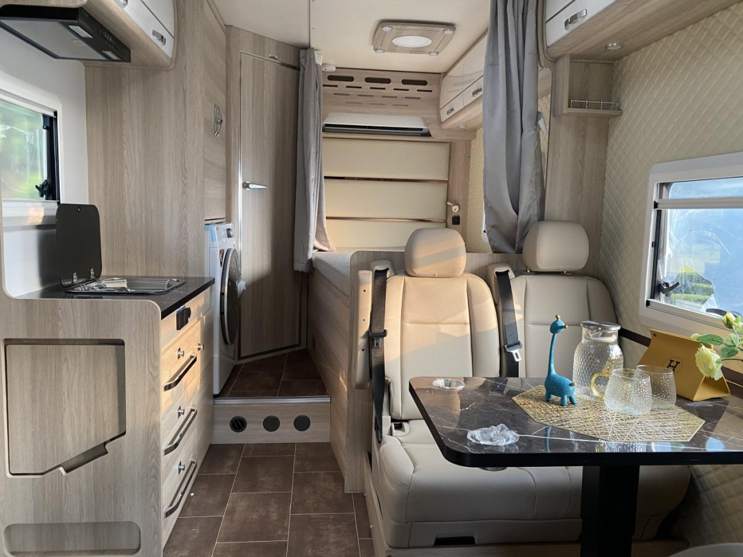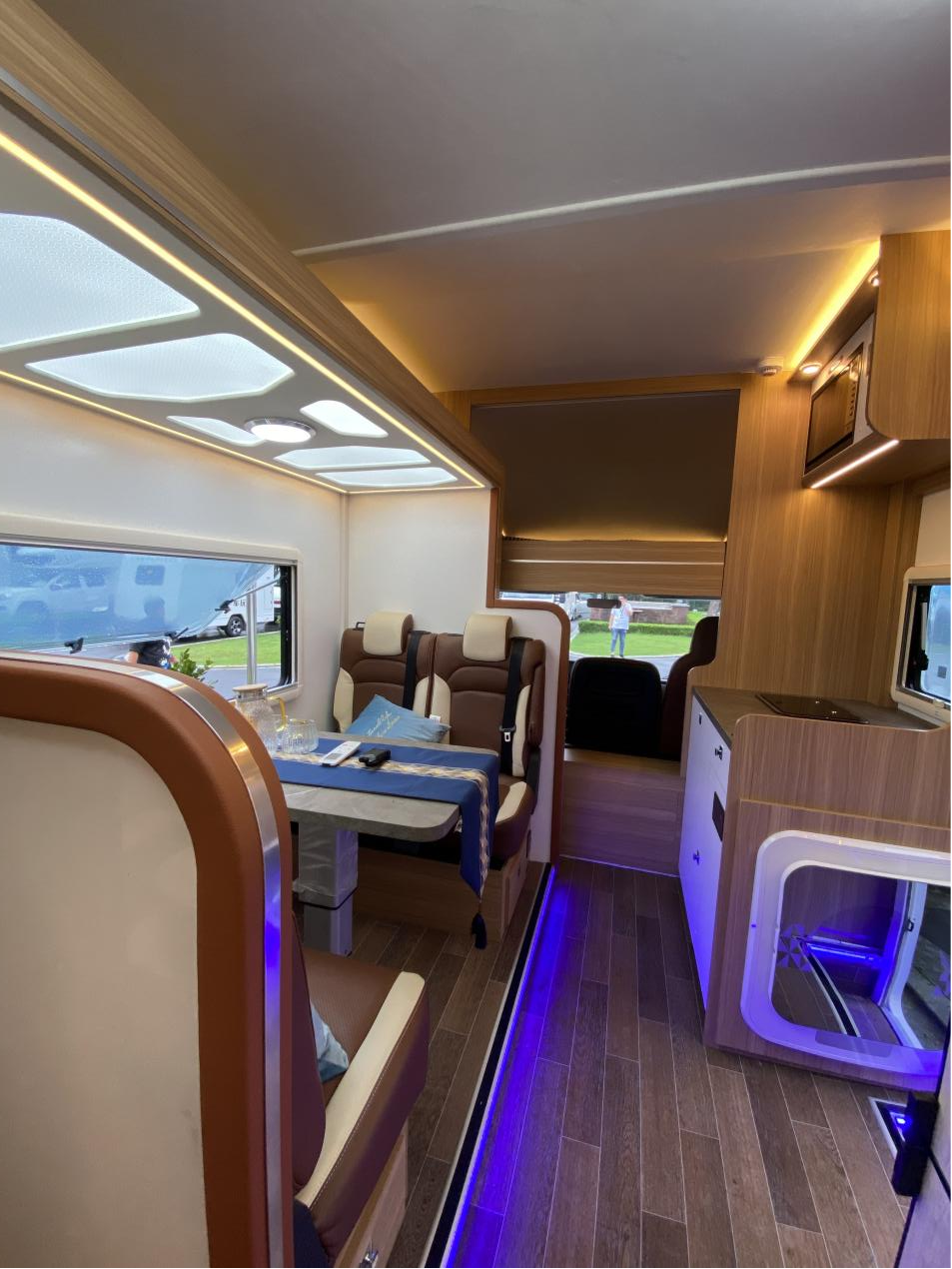 在内饰中采用极简风格设计,氛围营造的非常到位,大面积皮质包裹与杏木饰板相搭配,再加上浅色调的主调,不论是触觉还是视觉都营造出很强的高级感。生活区的配置方面该有的空调,冰箱,电视机那些都一应俱全,较网红3号而言少了一个侧方的拓展舱。