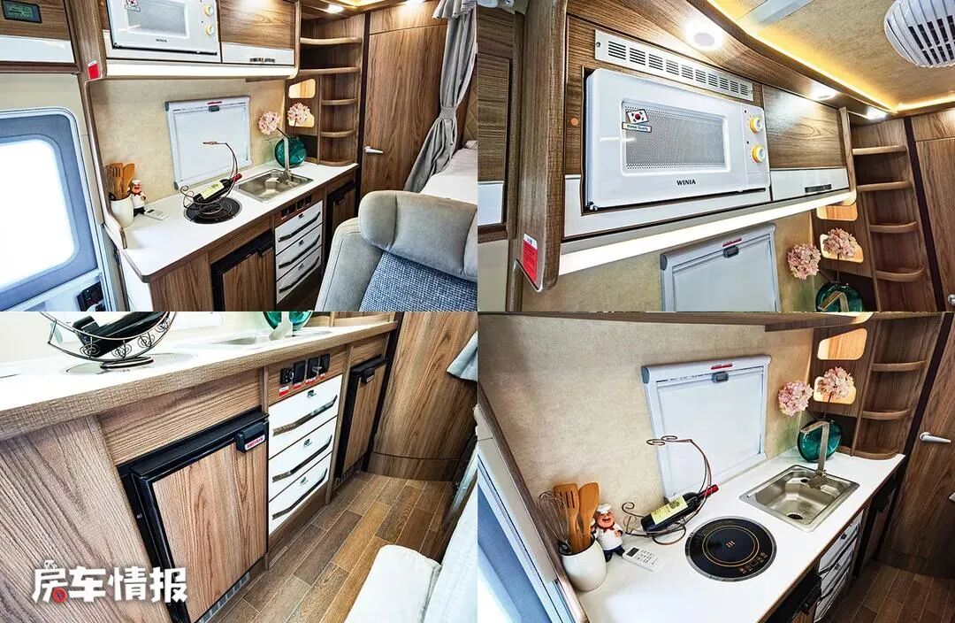 车内厨房区域位于车厢侧门后方,提供了微波炉、电磁炉、洗菜池、储物抽屉等设施,下方还提供了2个49L房车专用冰箱,可以单独实现冷藏或冷冻,使用比较方便。