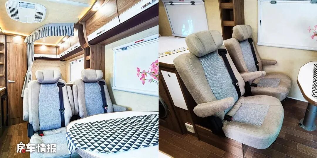 来到车厢内部,位于会区采用的是双人座椅+小餐桌的设计方式,双人座椅均采用的国家认证的3C座椅,可实现靠背、坐垫的单独调节,在长途乘坐时舒适性和安全性都能够得到保证。