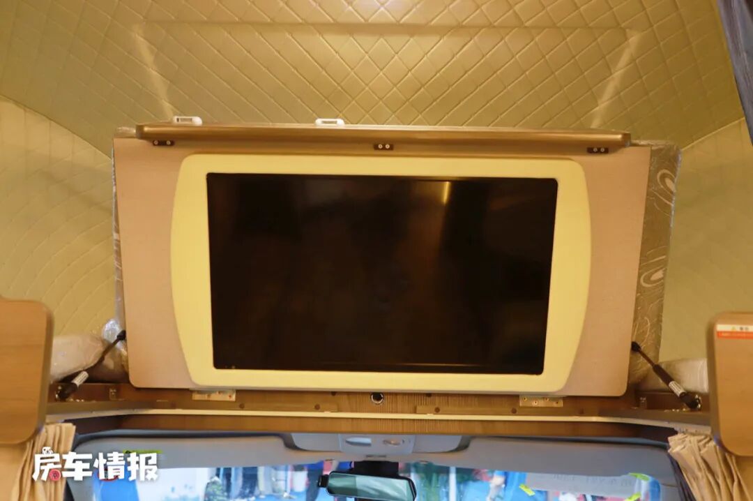 对了,虽然整车没有提供尾床,但是在前方大额头区域内还提供了一张尺寸为2200mm*1470mm的额头床,有些朋友说这睡不了两个人,那我只能说我尽力解说了……额头床实用的常见翻板式设计,床板下方还提供了一台32寸的液晶电视,满足平时的娱乐所需。