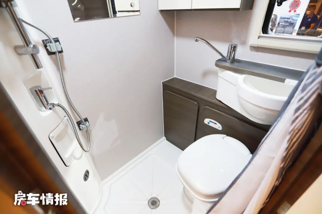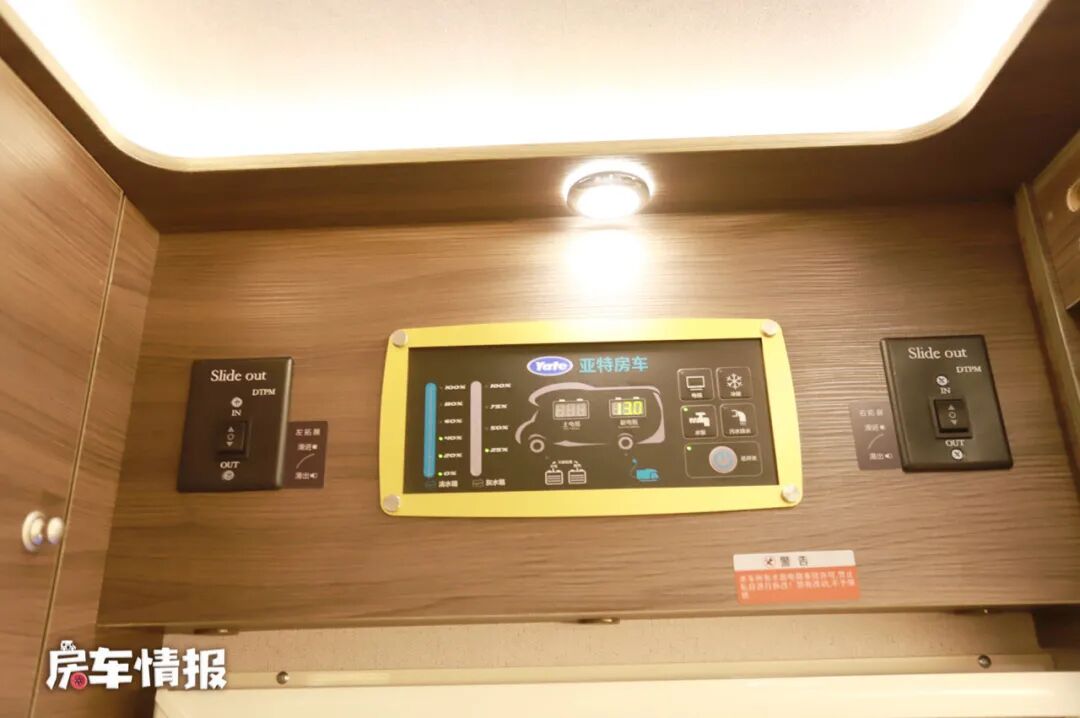 电路上,这款房车搭载了一台3000W的逆变器,提供了824Ah的磷酸铁锂电池,顶部还配备了一台500W的新能源单晶硅太阳能充电板,同时还带有150A+150A双发电机;水路上则提供了180L的净水箱和50L的灰水箱。