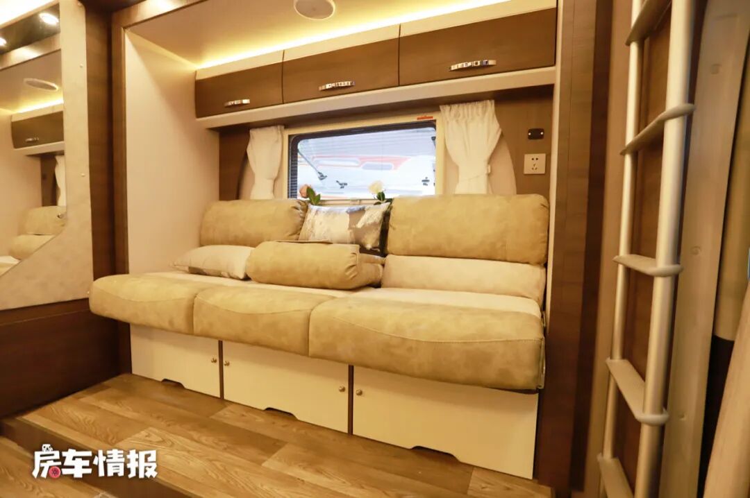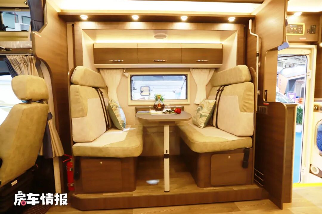 没有了后拓,又是右后上门,所以也取消了常见的尾床设计,车厢中部的区域就集合了会客与休息两个功能,一边是对坐式的四人沙发,另外一边则是长条沙发,长条沙发不配置安全带,所以平时行车上路时不能坐人。