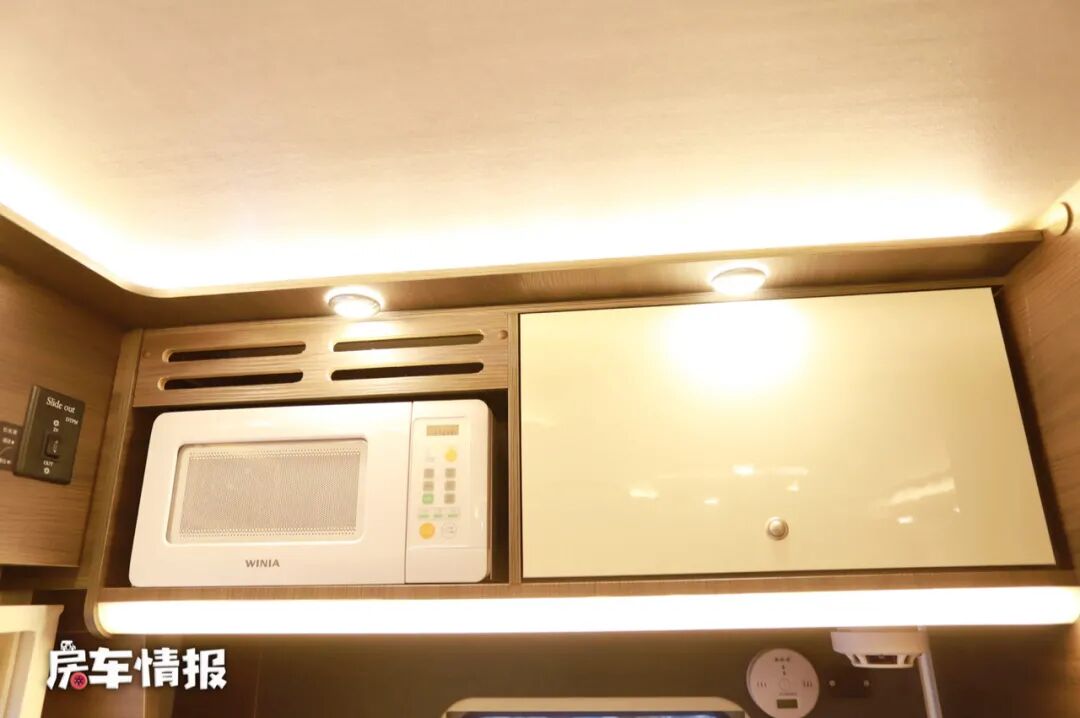 后上门的设计搭配的就是后置厨卫区的设计,厨房操作台提供了基础的厨用设施,包括带盖的不锈钢水盆、电磁炉;下方提供一台110L的冰箱和洗衣机,上方则提供了微波炉,这些设施也满足了更多的生活需求。