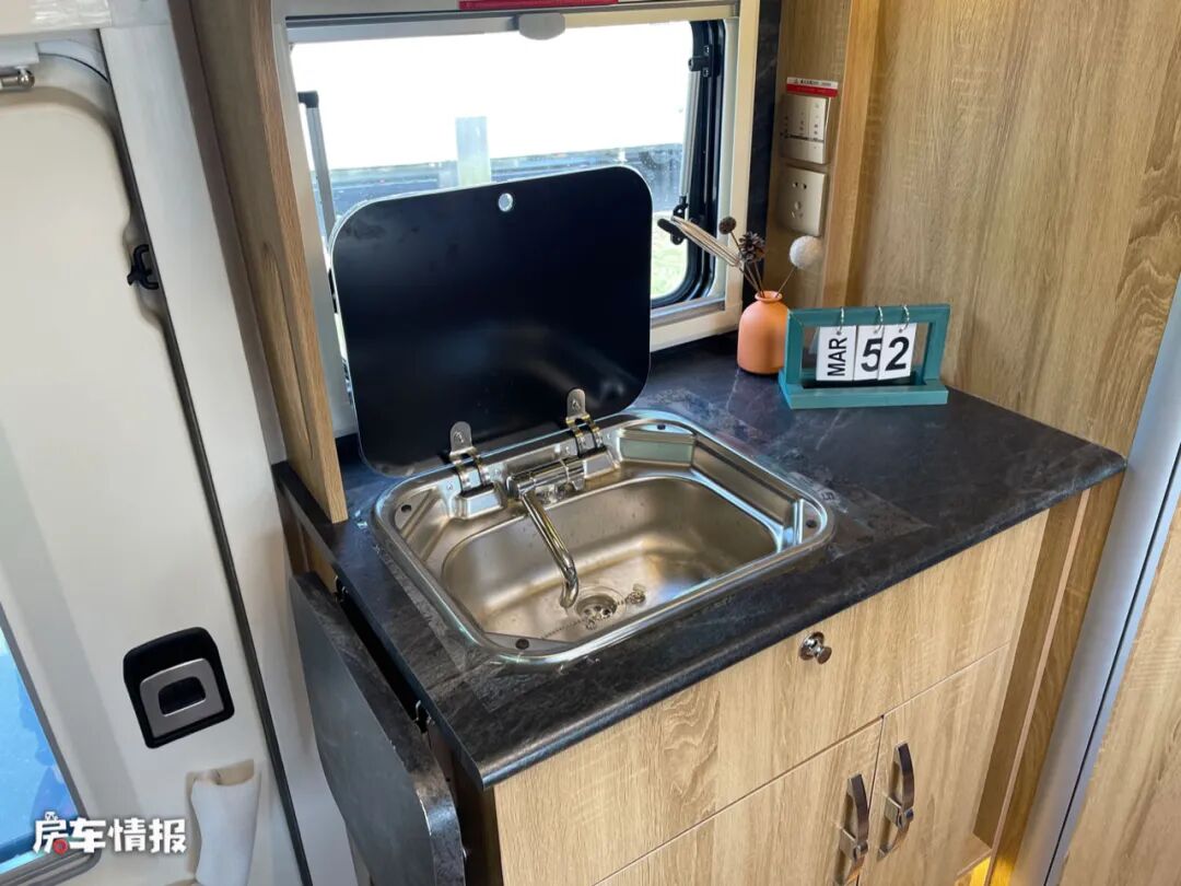 后方的厨房操作台还是一个比较中规中矩的设计,因为带有外置燃气灶,所以车内并没有配置,也免去了油烟带来的烦恼,不过还是提供了带盖的不锈钢水盆以及微波炉,可以在车内备菜,车外做饭。