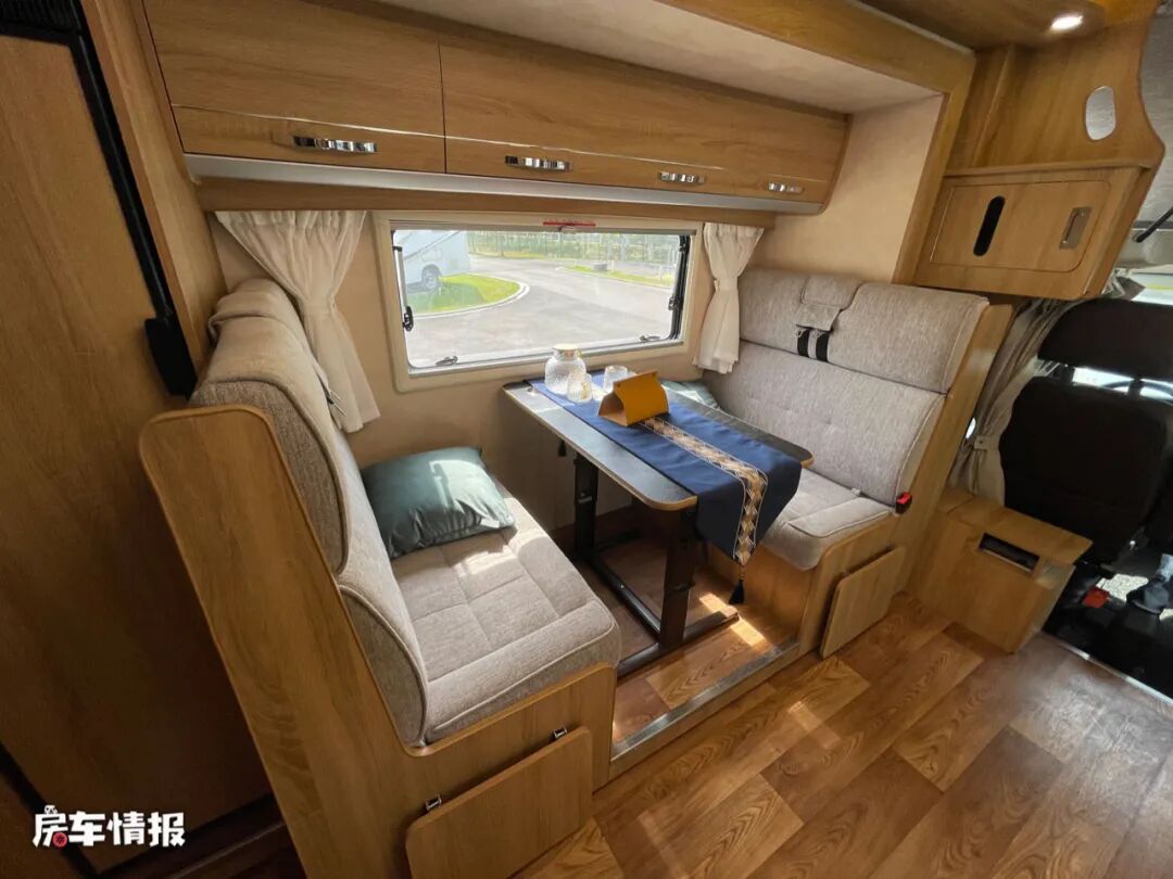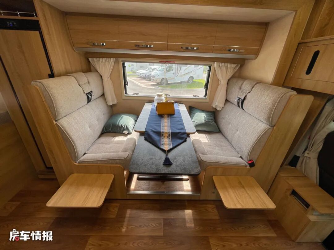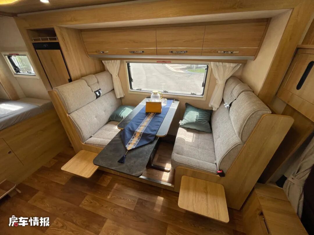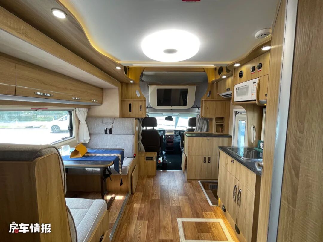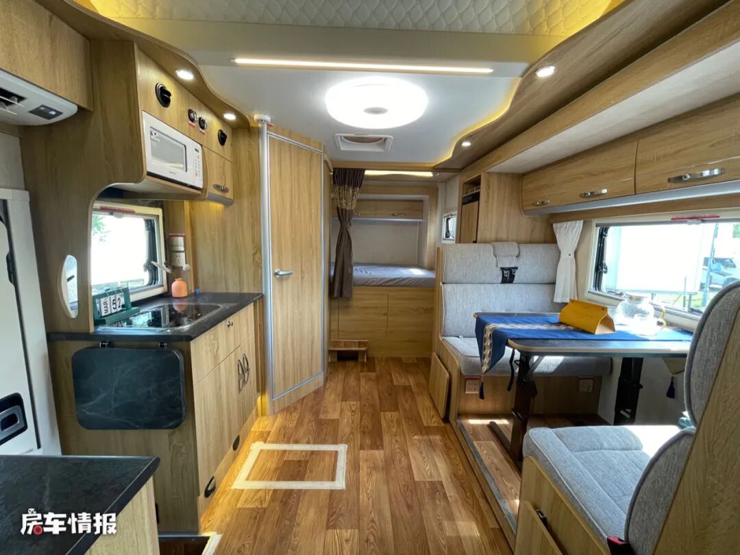 这款房车是一辆带有双拓展机构的车型,所以车内的空间对比无拓展的车型要更加的宽敞,而且整车的内部都使用木质工艺的家具,所以看起来既原生态又非常的温馨。
