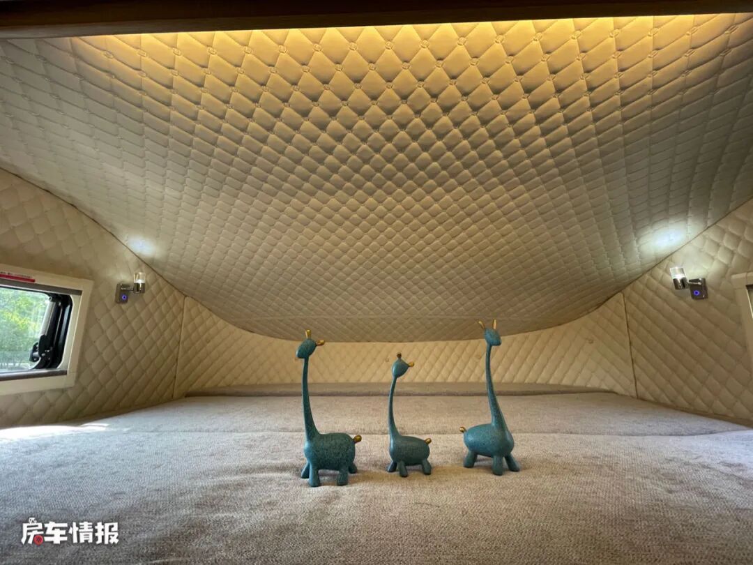 除此之外,在前方驾驶室上方的大额头区域内,还提供了一张尺寸为2210mm*1500mm的双人床,也能够为两个人提供睡觉休息的地方。而且整个额头区域都采用了软包装饰,也防止了平时会磕碰到头。