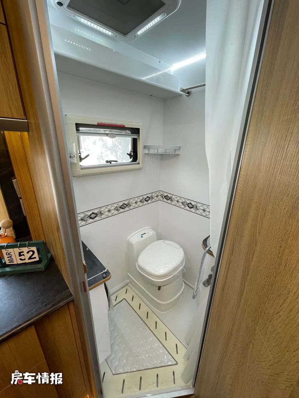 后方的卫浴室面积还是非常宽敞的,里面的配置也非常的齐全,包括洗手台、盒式马桶、淋浴花洒、换气扇等,完全可以满足出行的洗漱需求,而且还带有独立的暖风出口,即便冬天洗澡也不会寒冷了。
