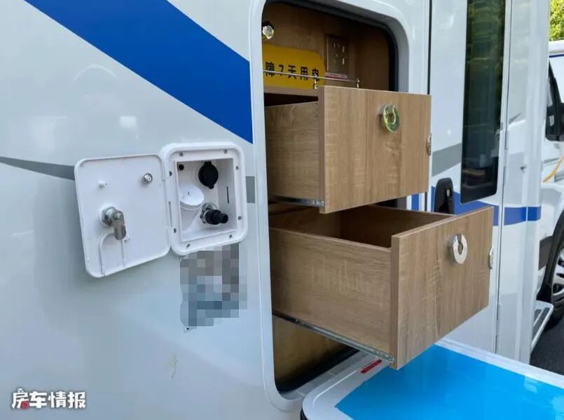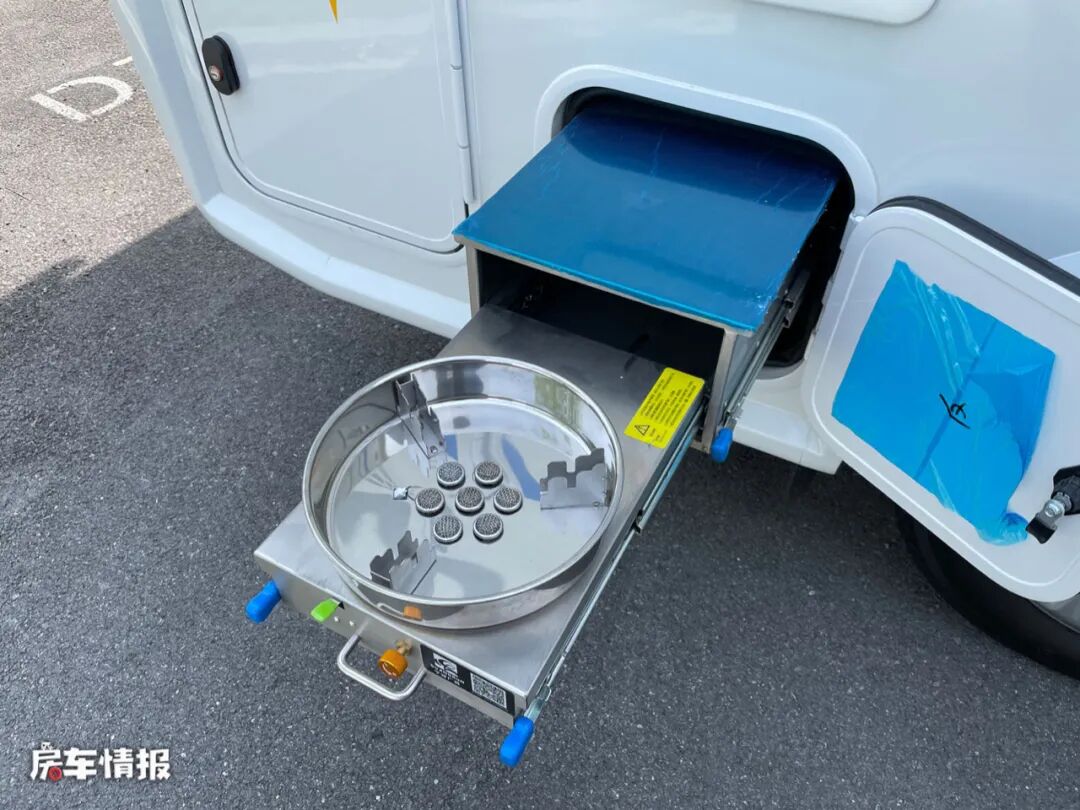 车厢外部配置了非常齐全的生活配置,包括手动遮阳棚、外置抽拉燃气灶、外置翻板以及双向抽拉式储物抽屉、左右贯通式的储物舱和水电接驳口。
