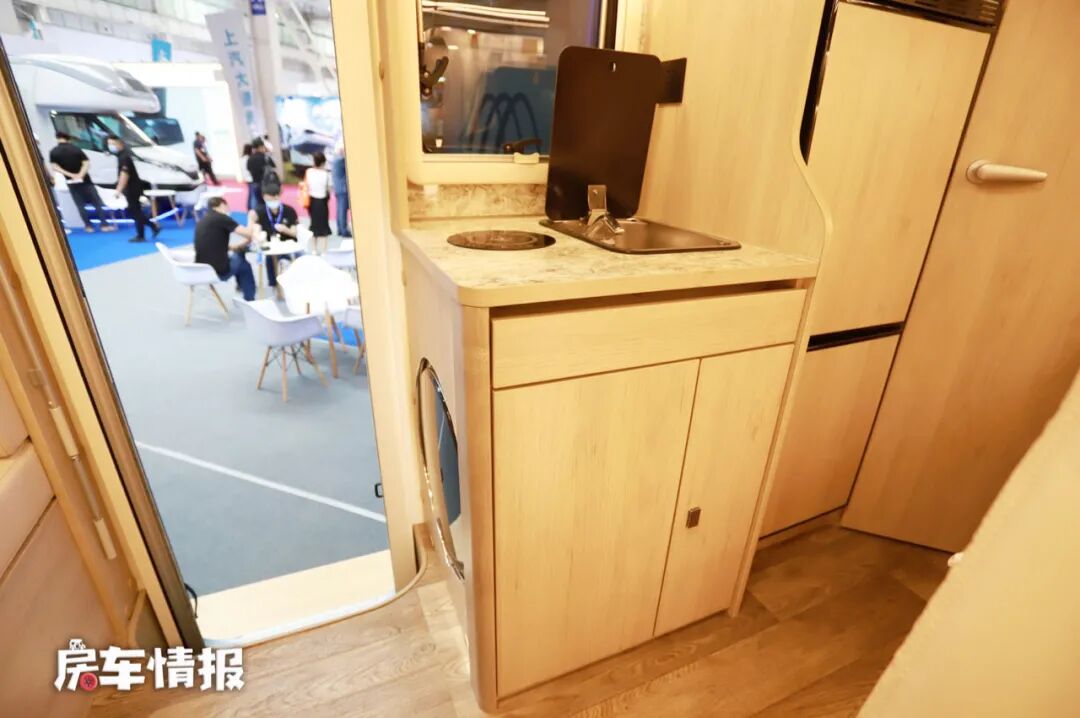 临近乘客门的后方是全车的厨房操作台,尺寸比较迷你,提供了电磁炉与水槽,侧面还镶嵌了一台洗衣机,同时上下方也留有储物柜,虽然储物的空间不是很多,但是存放平时我们的烹饪用具还是足够的。