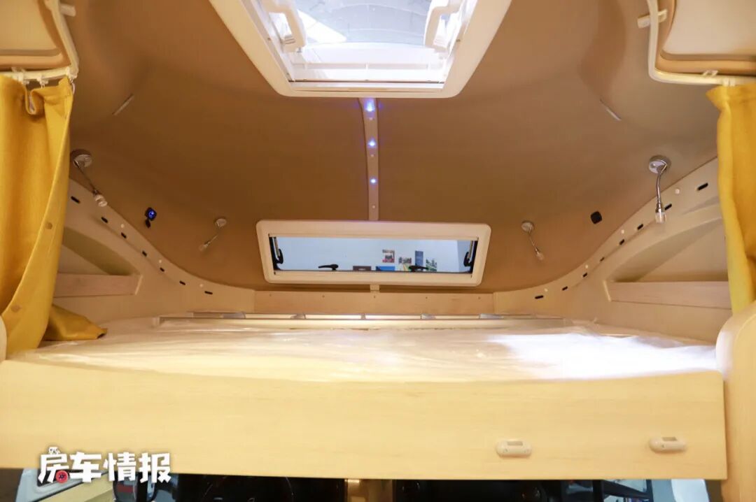 另外在前方的额头区域内,还提供了一张双人床,尺寸为2000mm*1500mm,也能为两个成年人提供睡觉休息的地方,而且额头处带有两个天窗,所以整体的通透感还是不错的。