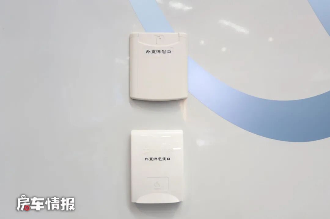车身外侧的生活配置也比较齐全,包括带有LED灯的手动遮阳棚、外置抽拉燃气灶、水电接驳口和行李舱等。同时全车还配备了电动支腿,提升了驻车时的平稳性。