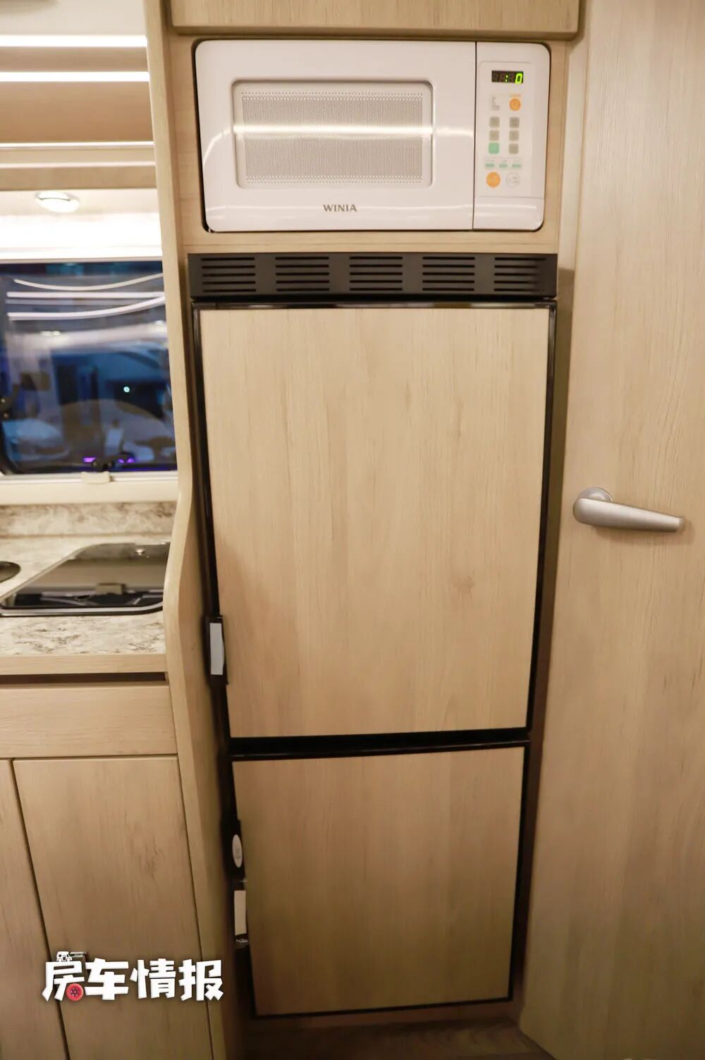 厨房操作台与后方的卫浴室之间还放置了一台148L上下双开门的冰箱以及一台微波炉,可以存放一些食物,也满足了更多的生活需求。