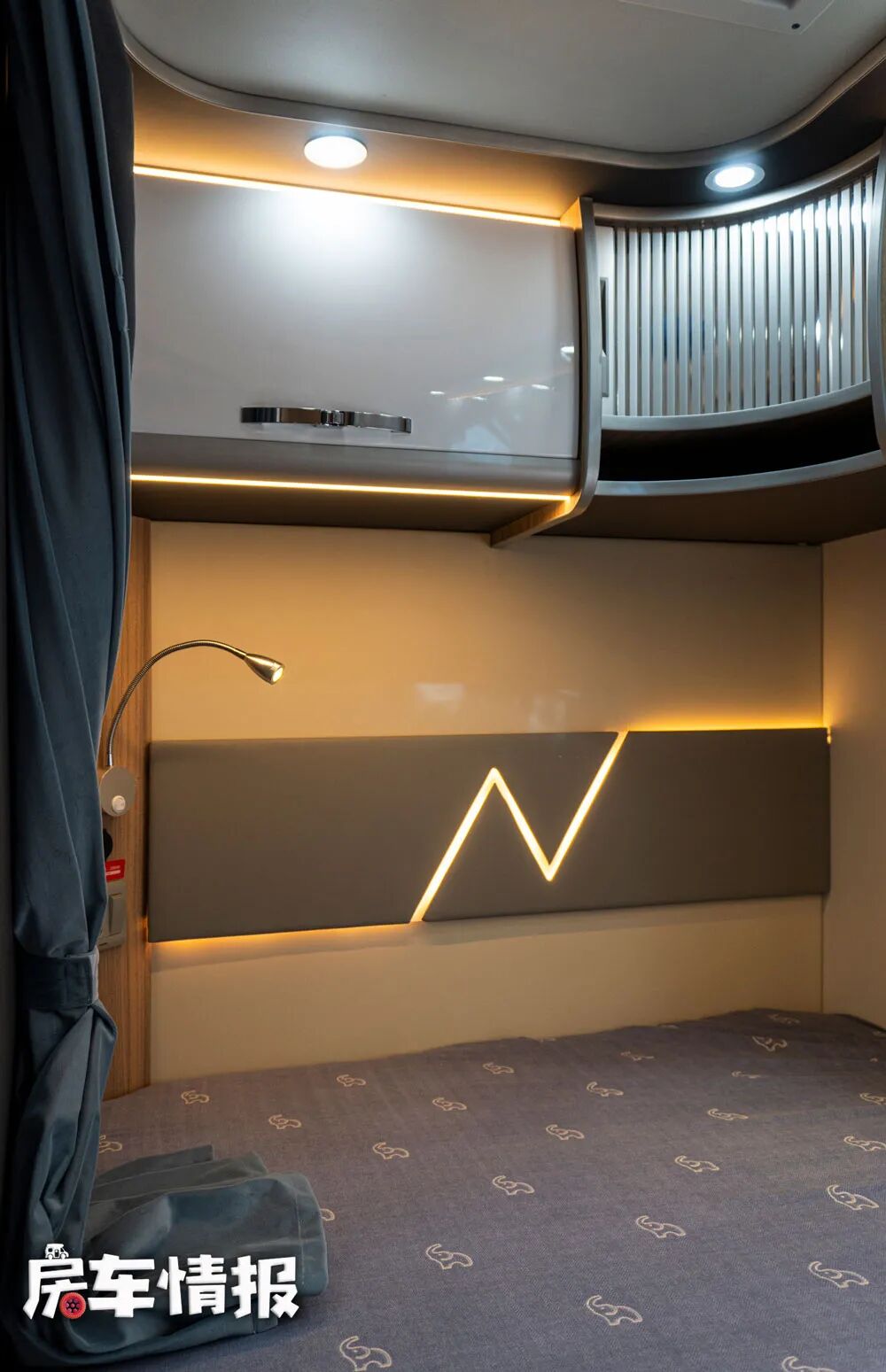 车内的休息区内提供了一张1900mm*1200mm的纵置双人床,平时可以容纳两个成年人睡觉休息。床头处带有新颖的灯光设计,更加彰显了整体的氛围,同时上方提供的多个储物吊柜,也可以存放平时的一些换洗衣物。