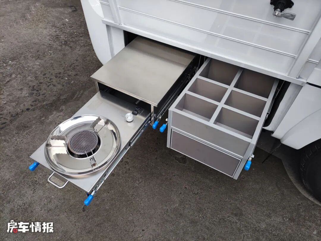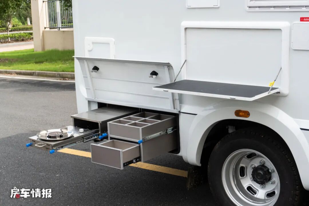 车身外部保留了丰富的生活配置,包括手动遮阳棚、外置翻板、外置抽拉燃油灶、外置置物架、储物舱和水电接驳口等,丰富了车外的生活。