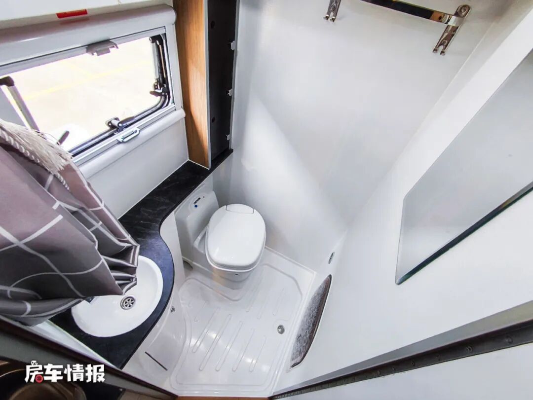车厢尾部的卫生间门外侧带有一面全身镜,为爱美的女性提供了便利,内部的配置也比较齐全,包括马桶、淋浴花洒、梳妆镜、置物架和镶嵌在侧面壁板上的洗衣机,完全可以满足出行在外的洗漱需求。