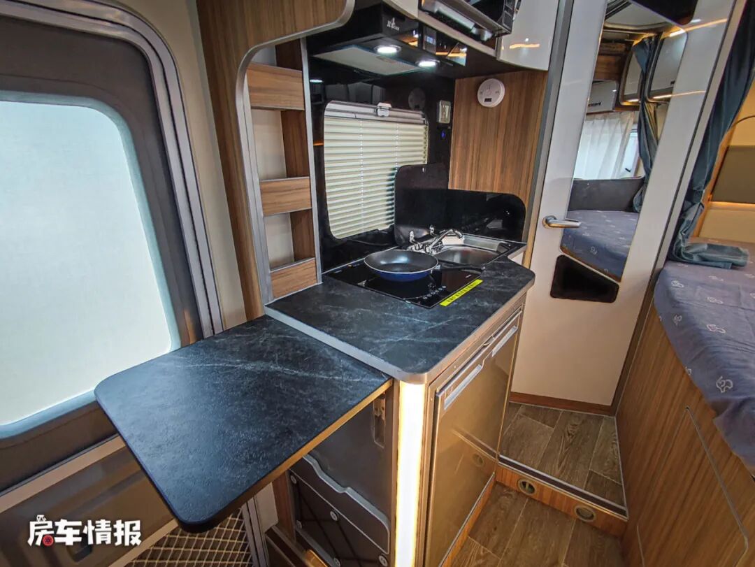 乘客门后方的厨房操作台上也配置了比较完善的厨用设施,包括电磁炉、水槽、抽油烟机、微波炉和冰箱,同时台面左侧还带有可拓展的小桌板,提升了整体的空间面积。