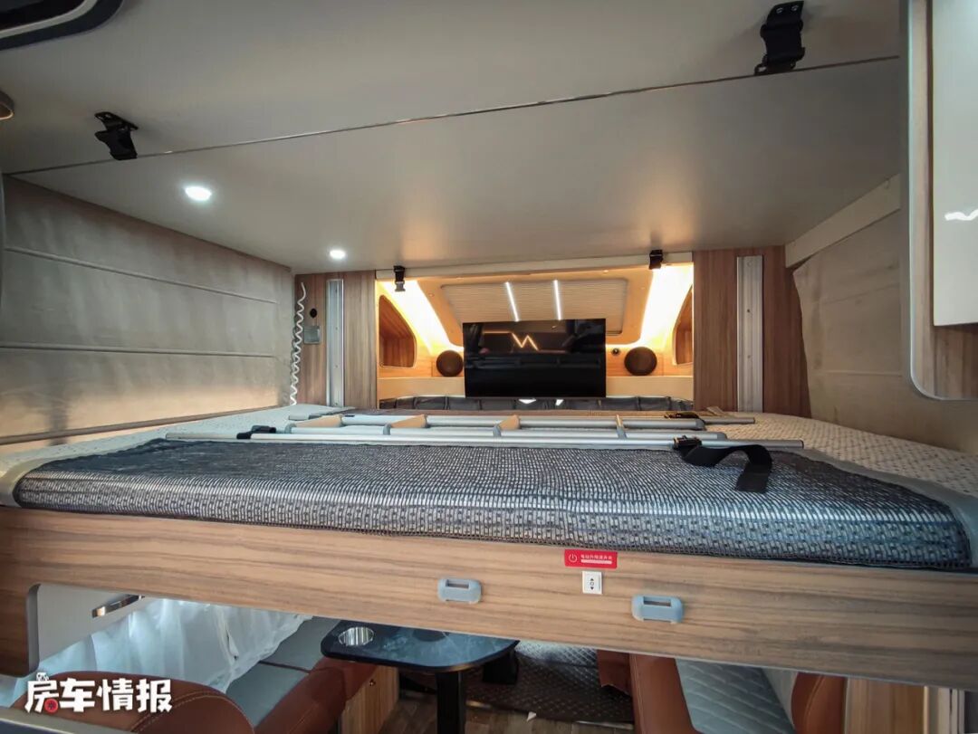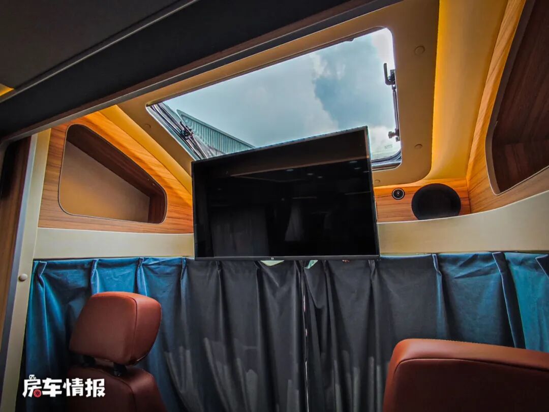 小顶设计也取消了常见的额头床,取而代之的是一台智能网络电视,平时可以连接WIFI观看,顶部的大尺寸天窗也为全车的内部带来了良好的采光度,非常的通透。