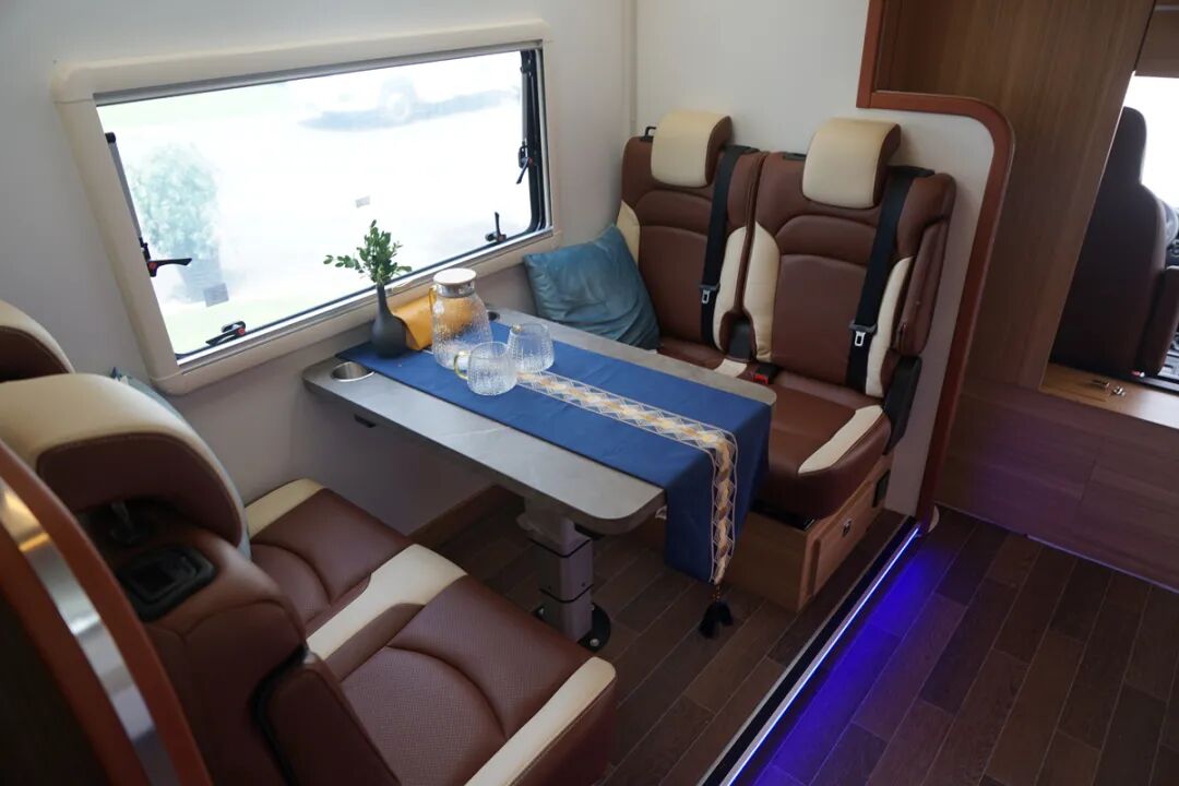 位于左侧拓展区域内的会客区,整体面积非常可观,皮艺沙发突显了整体的豪华性,而且也提升了整体乘坐的舒适感,中间的升降餐桌也足够平时大家坐在这里吃饭小聚使用。