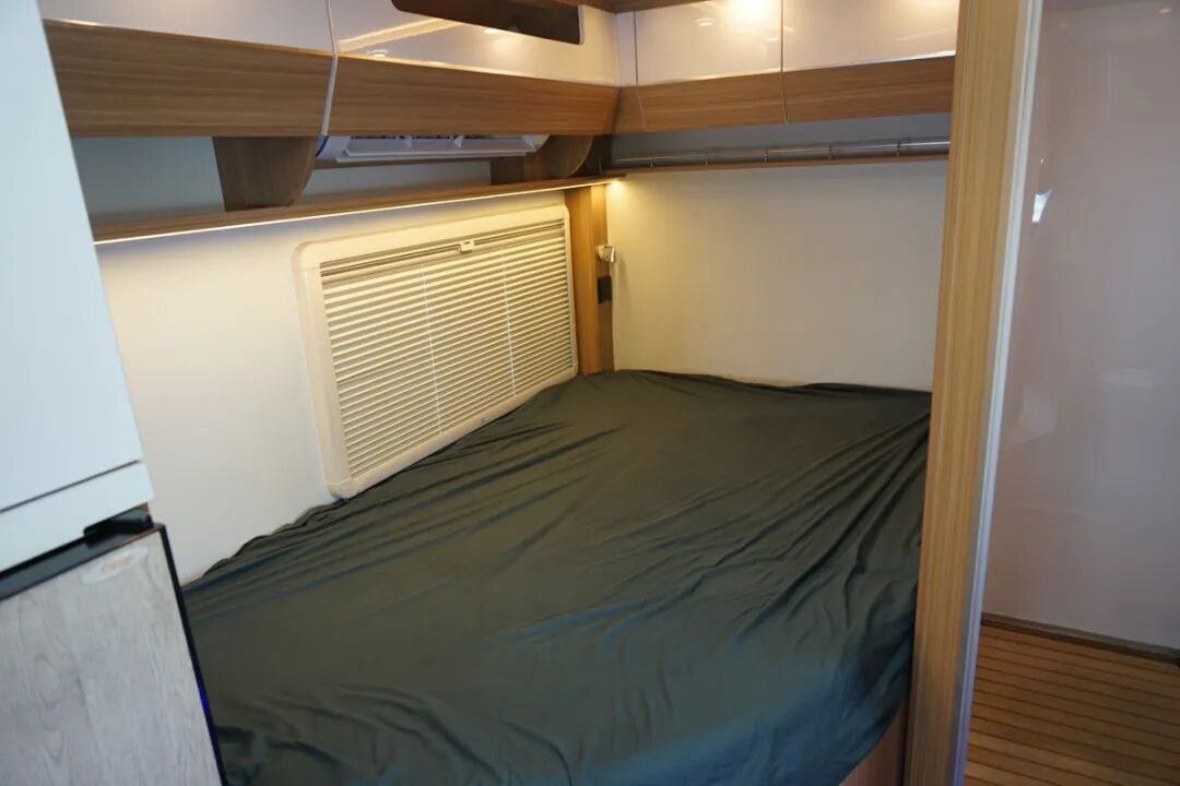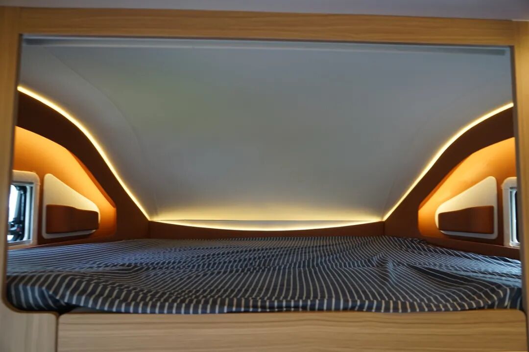 驾驶室后方的小登台,既起到了分隔的作用,也可以作为上下额头床的一个台阶,额头区域内的额头床空间足够躺下两个成年人,尺寸为2200*1400mm,两侧不仅带有外推窗以保证通风换气和采光度,同时还设计了氛围灯,将额头区域打造的非常温馨,尤其是雨天的时候感觉更加的惬意。床板采用了上翻式的设计,所以下方还隐藏了一台32寸的电视,晚上吃饭的时候也可以看看电视放松一下一天疲惫的生活。