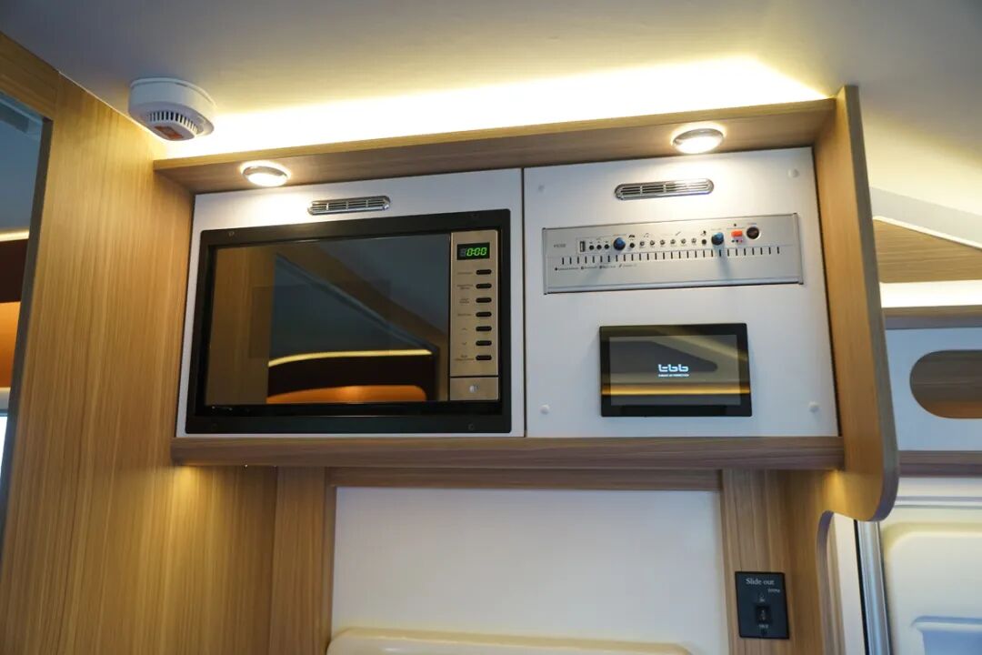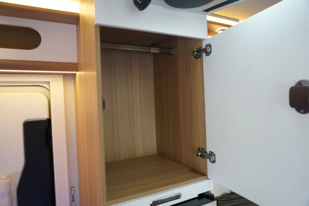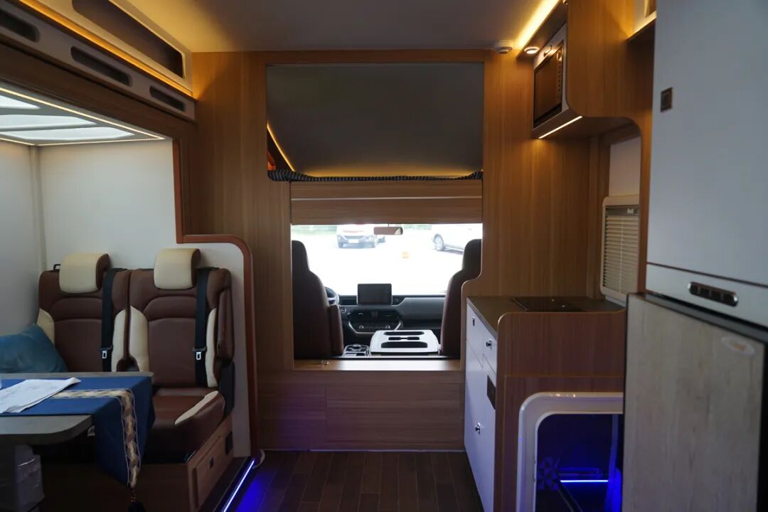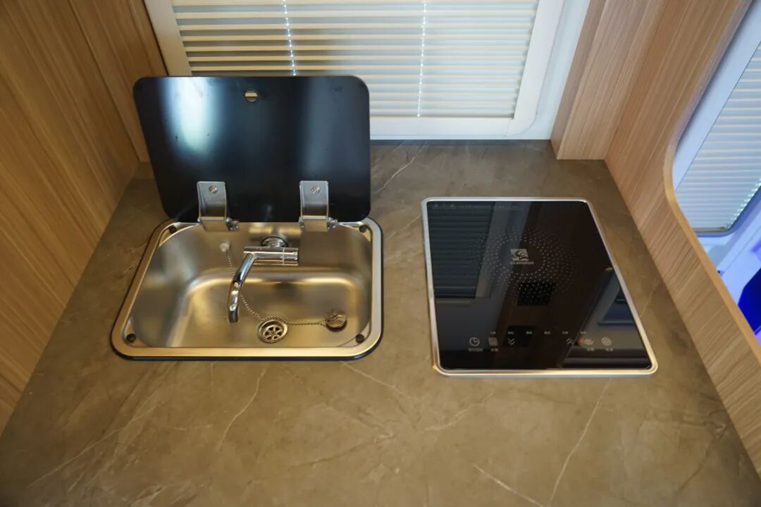 中上门的设计为乘客门前也预留出了更大的使用空间,这款房车利用了这个区域并打造成了厨房操作台,既远离了后车厢的休息区,也更加贴近会客区,上菜也更快一些。
