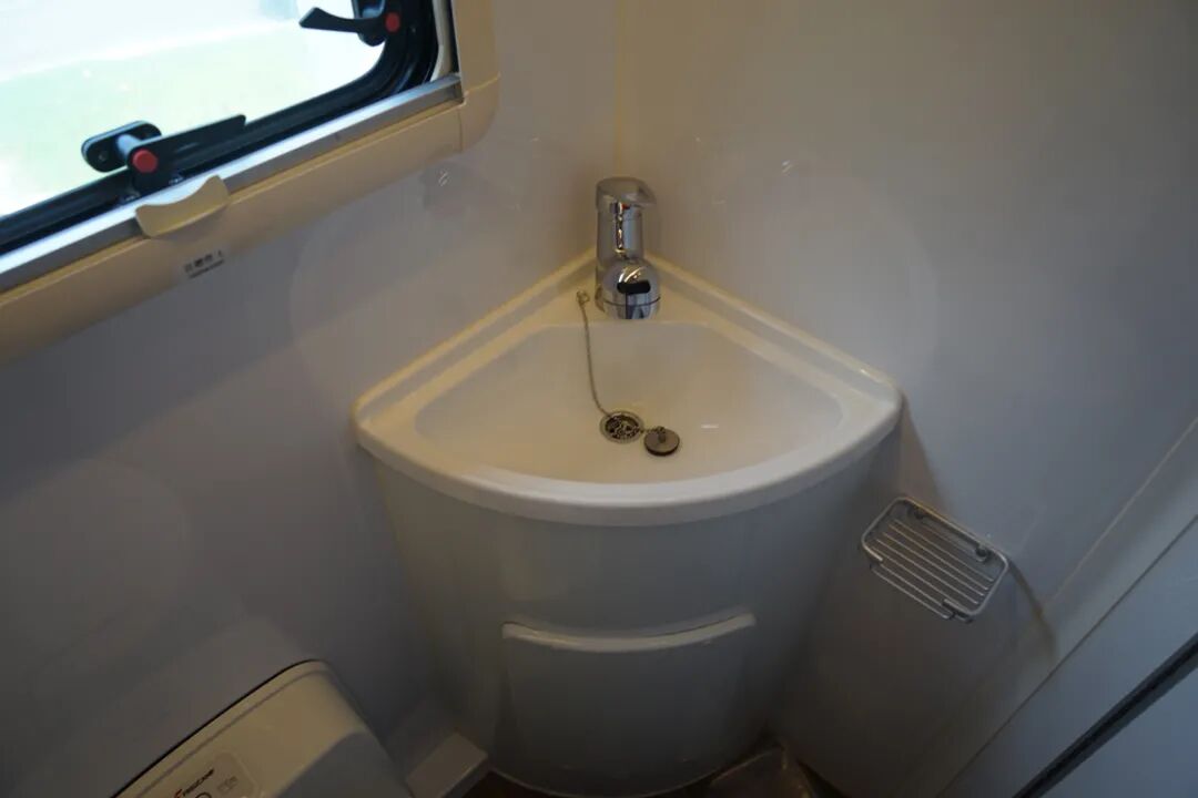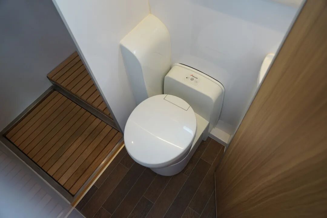 这款房车的卫浴室采用了一个更加实用的干湿分离设计方式,外侧为卫生间,提供了马桶和洗手台,内侧为淋浴区,提供了淋浴花洒和置物架,这样的设计也避免了使用尴尬,更加的人性化。