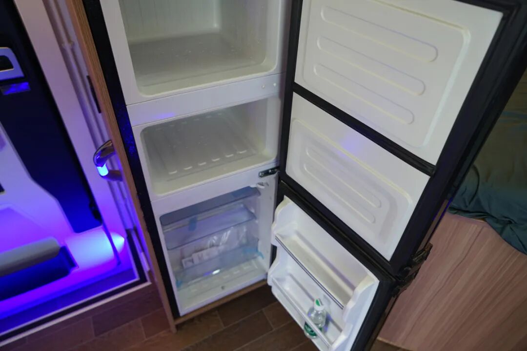 乘客门后方的133L双开门冰箱,内部提供了两层冷冻空间,可以更好的将食物分类,拿取的时候也更加的方便。