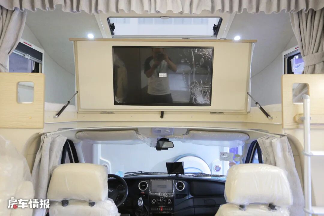 额头区域内提供了一张双人床,平时也可以提供睡眠休息的空间,而且三面环窗,整体感觉也特别通透。床板下方还隐藏了一台32寸的液晶电视,平时可以看看电视打发休闲时间。