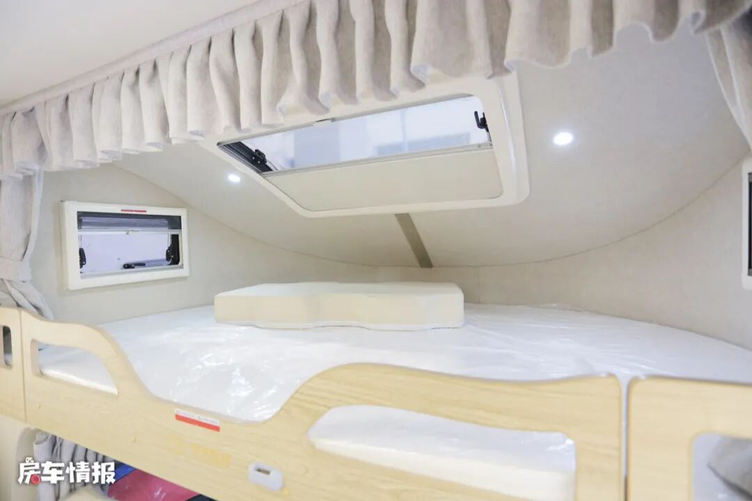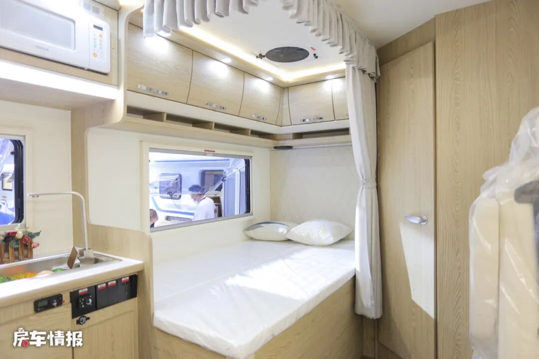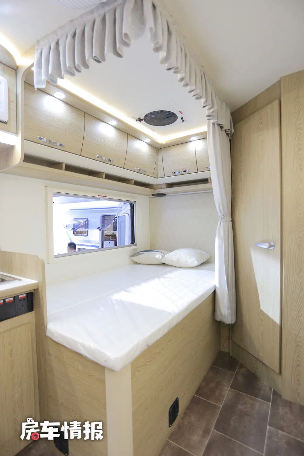 双人尾床可以为两个成年人提供睡觉休息的地方,上方还带有一圈L型的储物吊柜可以存放平时的衣物使用,顶部的换气扇则可以通风换气。