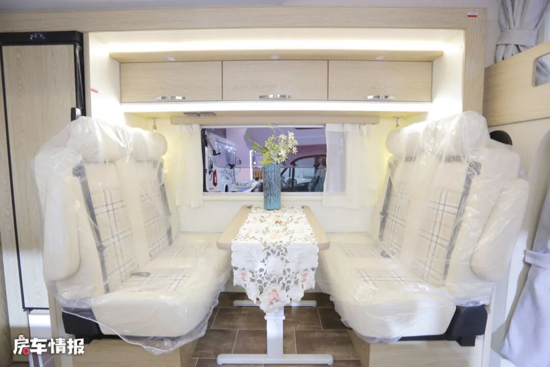 左侧拓展区域内是全车的会客区,提供了四人对坐式沙发和一张餐桌,这张餐桌不同于以往我们常见的升降餐桌,而是更像学生时代的课桌,是随时可以移动的,也就是说它还可以搬到车厢外使用。晚上的时候这里也可以变成一张沙发床,睡1-2个小朋友还是完全够用的。另外在沙发的上方还提供了多个储物吊柜,空间上也比较宽敞,可以存放平时一些常用的物品,拿取的时候也很顺手。