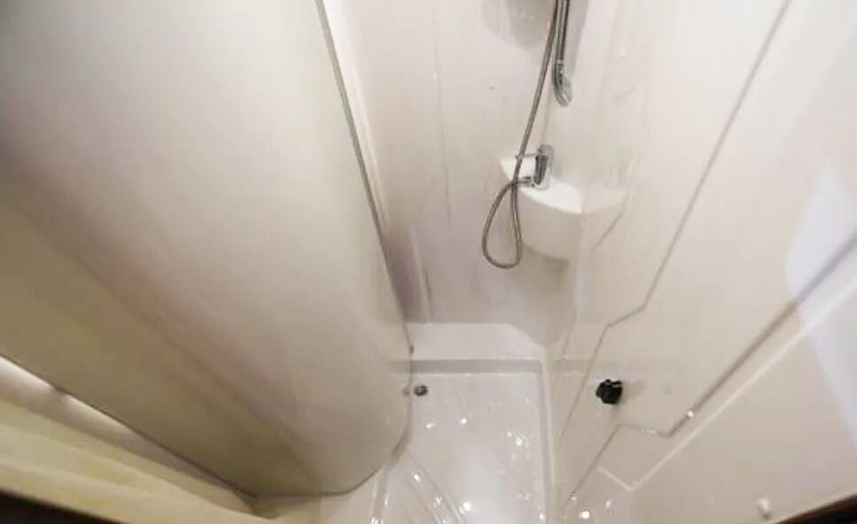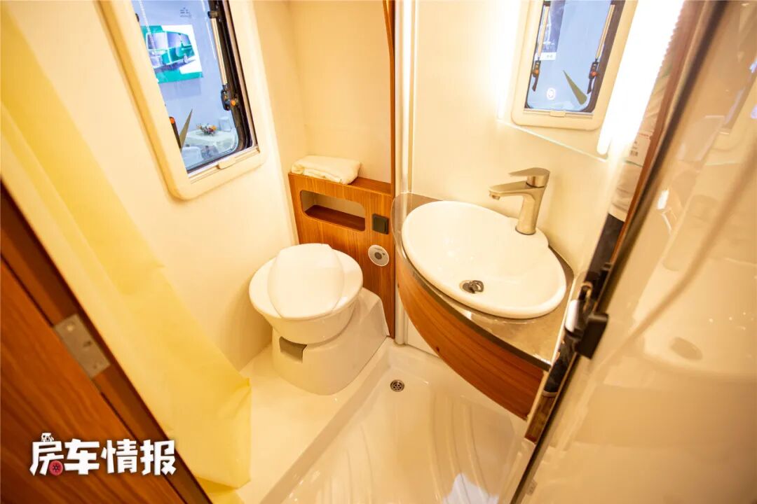 卫生间位于车厢尾部,采用了一个同类型国产房车中首次出现的设计,常规状态下卫生间内部和普通房车里的区别不大,洗手池、盒式马桶、梳妆镜、换气扇等一应俱全,但是它的奥妙之处在于可以将洗手池以及梳妆镜整体反转,变成一个独立的淋浴间,这样的就变成了一个干湿分离的卫生间,十分巧妙。