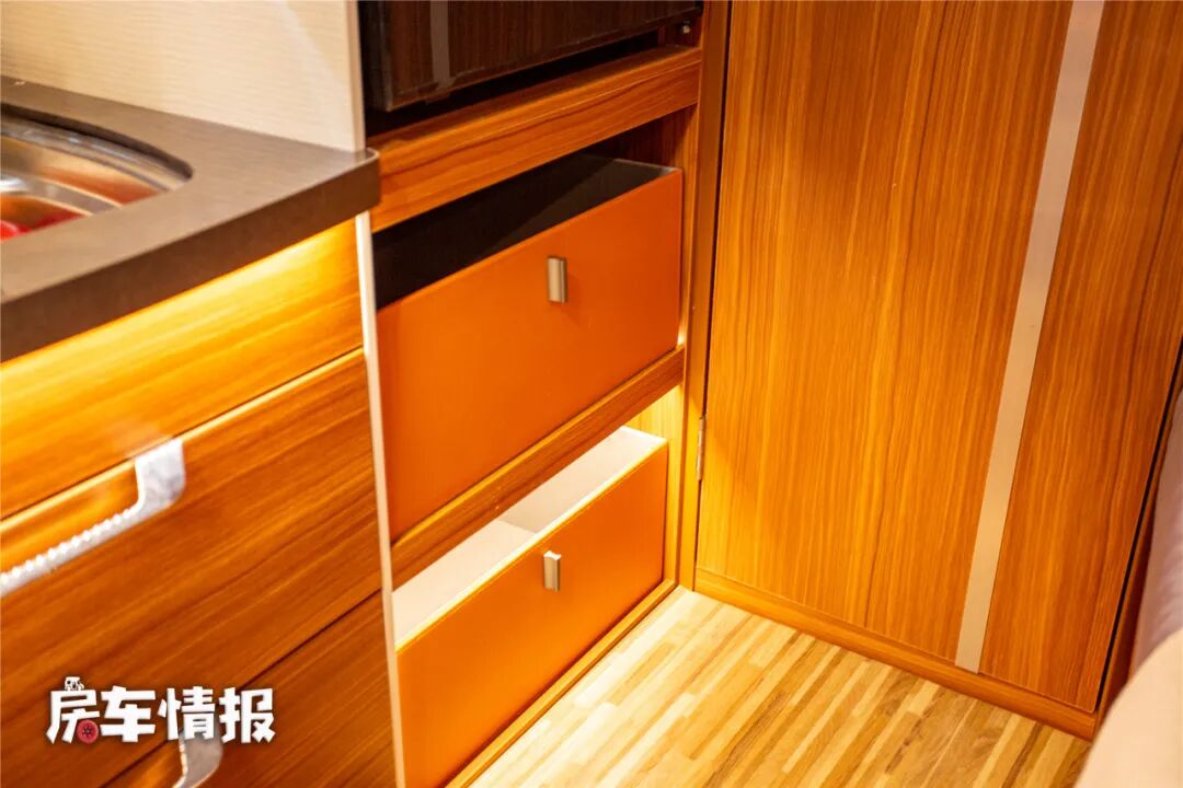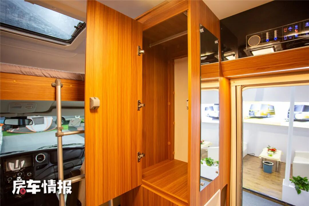 位于双人座椅的另一侧是车内的一组大型衣柜,可以把一些容易褶皱的衣物存放在里边,不用担心褶皱。位于橱柜下方,还提供了一个开放式储物格,内侧带有插座,方便在这里使用电饭煲等设备,也不用担心会滑落。