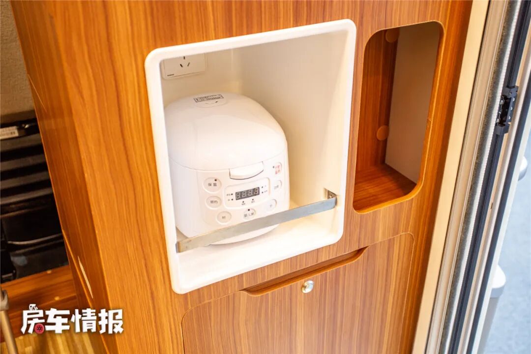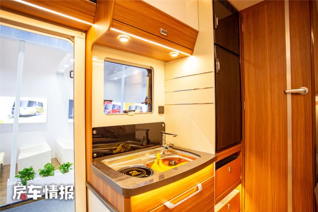 车内的厨房位于中门后方,整体设计比较简单,提供了电磁炉、洗菜池、冰箱等基础设施,日常旅行中可以做个简餐。