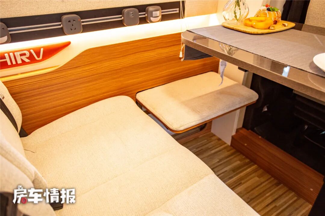 位于餐桌内侧还巧妙地设置了一个可以翻折的单人座椅,虽然行车时不可以乘坐,但驻车以后可以打开增加一个座位,临时坐着吃饭聊天也挺不错。
