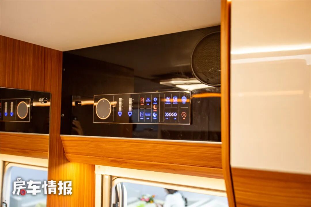 车厢中门上方则是车内的一个中控台区域,这块由大驰智能自主研发设计的控制屏,可以和自家开发的APP相连通,在手机上就能实时查看车内的水电使用情况。