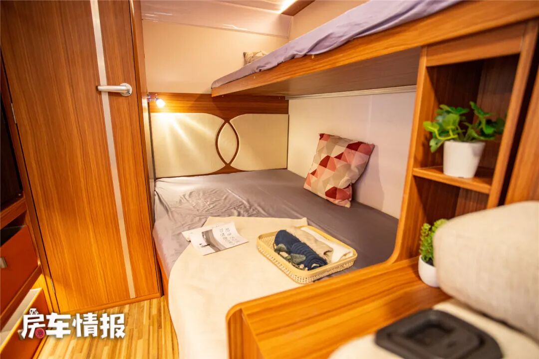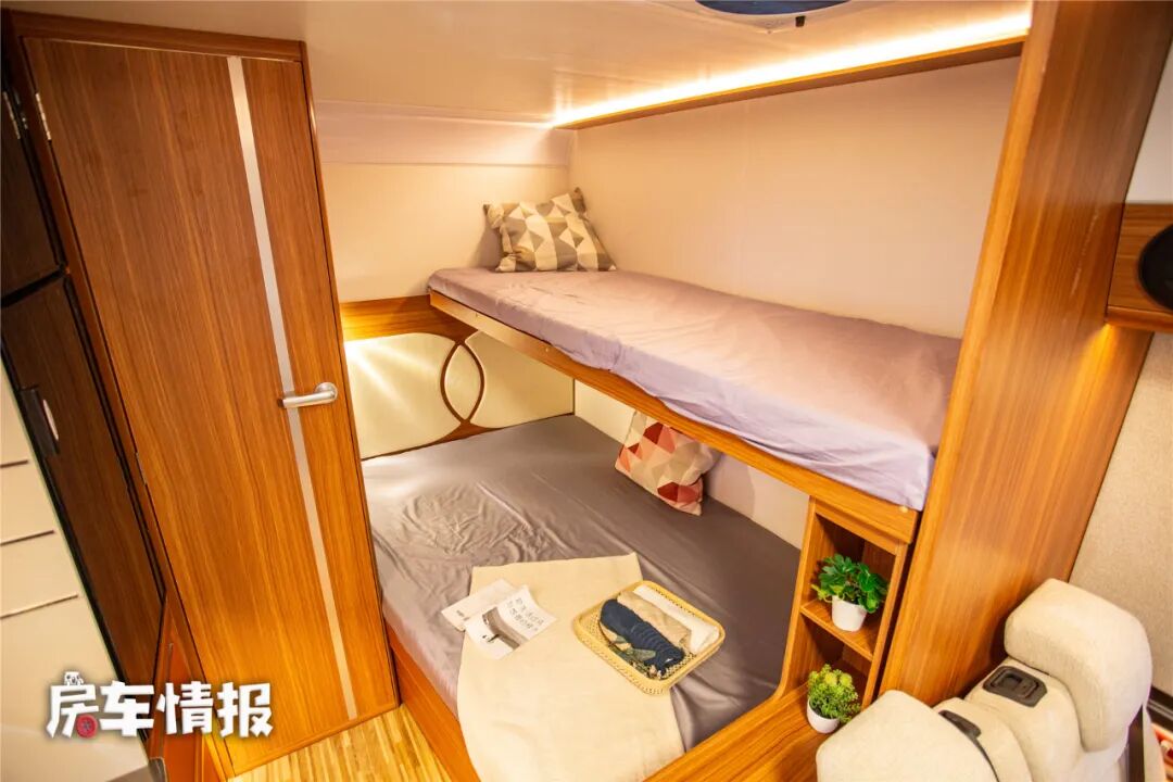 在车厢尾部还提供了一组上下双层子母床,可以满足3人睡眠,值得一提的是位于下层床前方的隔板处采用了一个半开放式的设计,这样就让整个区域显得比较通透,另外下层床的高度比较低,老人、孩子上下床都会比较方便。