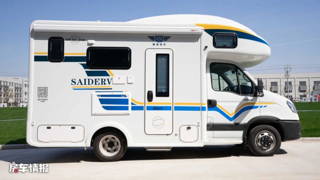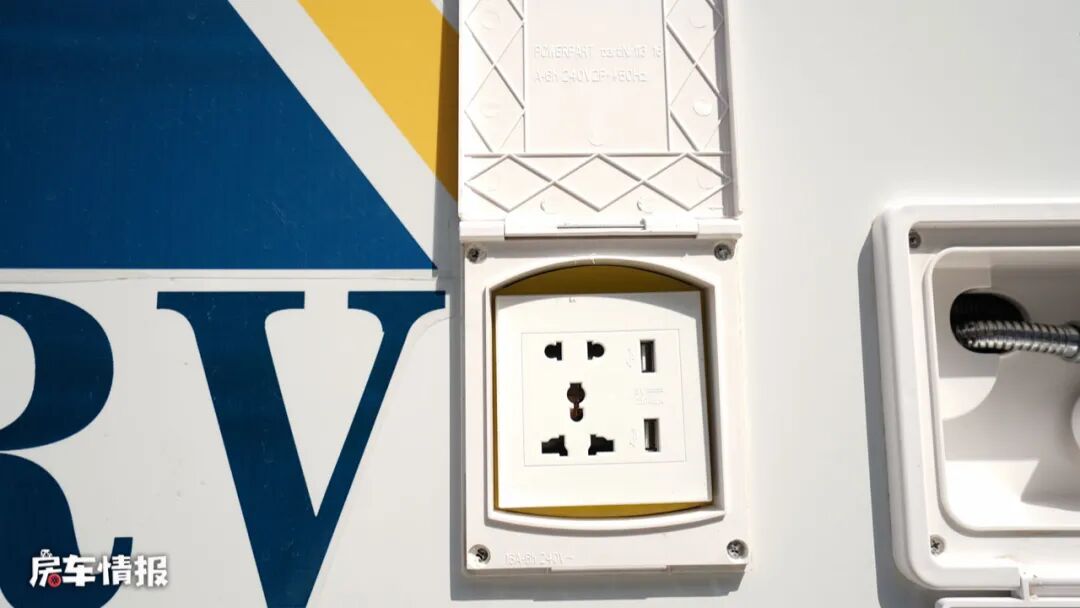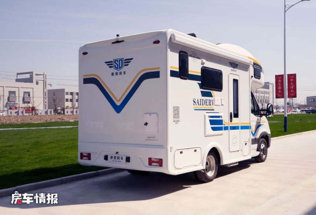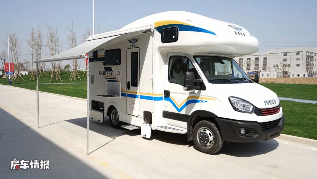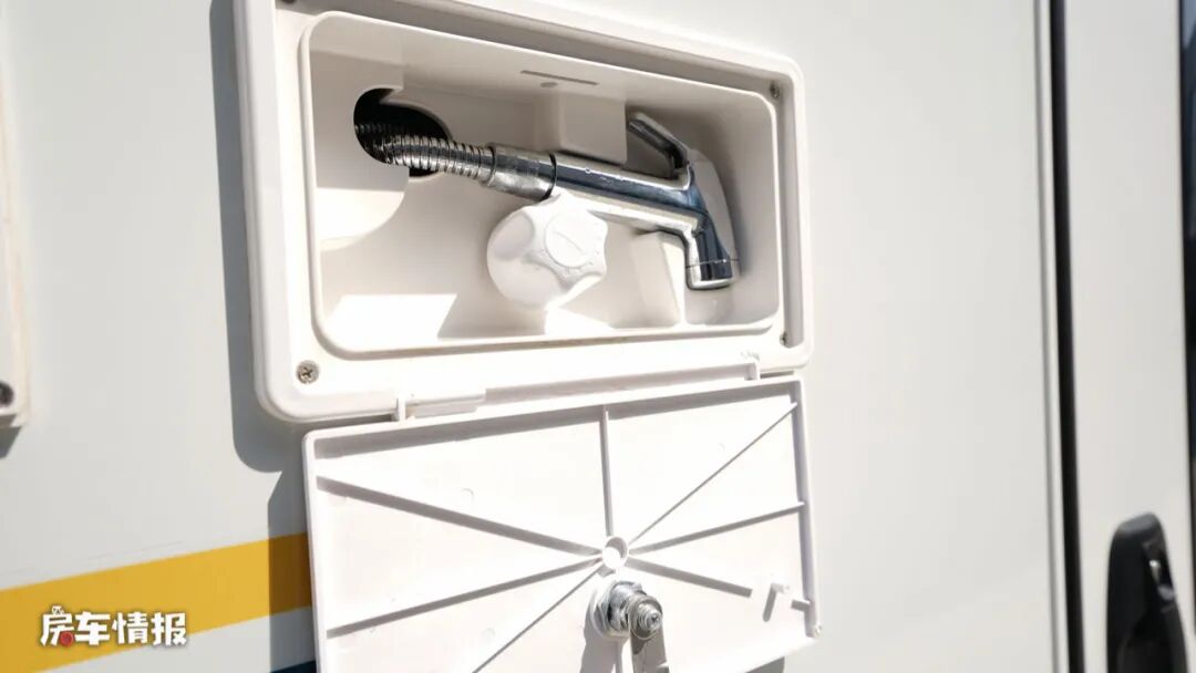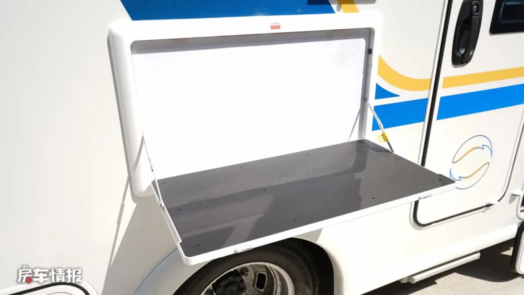 车身外观依然是以主流的白色为基调,搭配蓝色与黄色的彩带,增添了海洋的气息,车身外置配置了非常丰富的生活设施,包括遮阳棚、抽拉式燃气灶、外置淋浴花洒、外置翻板、储物舱以及水电接驳口,平时天气好的时候,也可以选择在车外进行烹饪就餐。