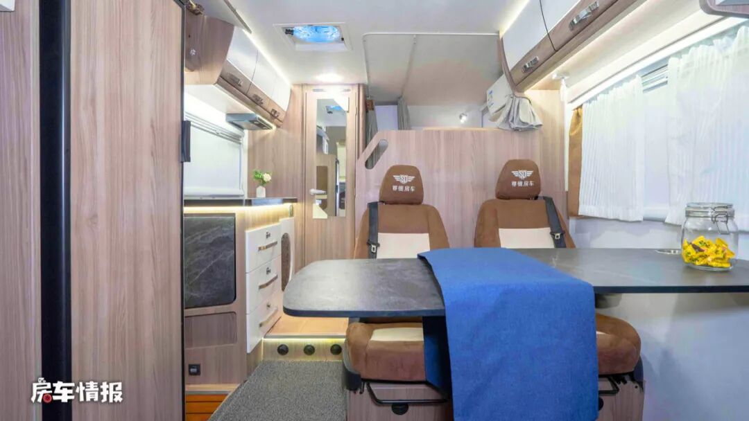 整车采用了一个右前上门的设计方式,车内的布局设计也比较主流,双人会客沙发+可升降餐桌组成了一个小型的会客区,带有头枕和扶手的沙发提升了乘坐的舒适感。