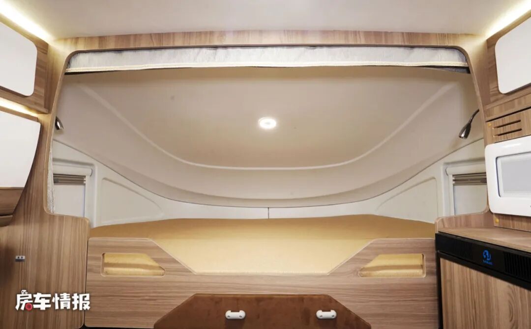 除此之外,在前方驾驶室上方的额头区内还提供了一张额头双人床,也可以为两个成年人提供睡觉休息的提房,上翻式的床板下方还带有一台32寸的液晶电视,满足平时娱乐所需。