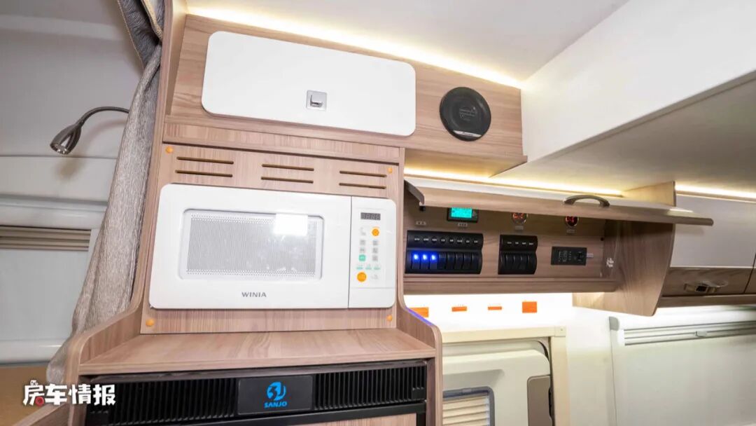 副驾驶后方放置了一台152L的车载冰箱,平时坐在会客区看电视的时候顺手就可以拿一些零食饮料,还是非常方便的。