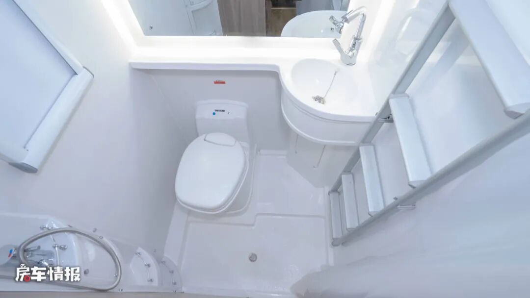 车尾部的卫生间内部还是非常宽敞的,全白色的色调更显通透,提供了马桶、洗手盆、淋浴花洒、带LED灯的梳妆镜和置物架等,平时出行在外洗漱需求还是可以解决的。